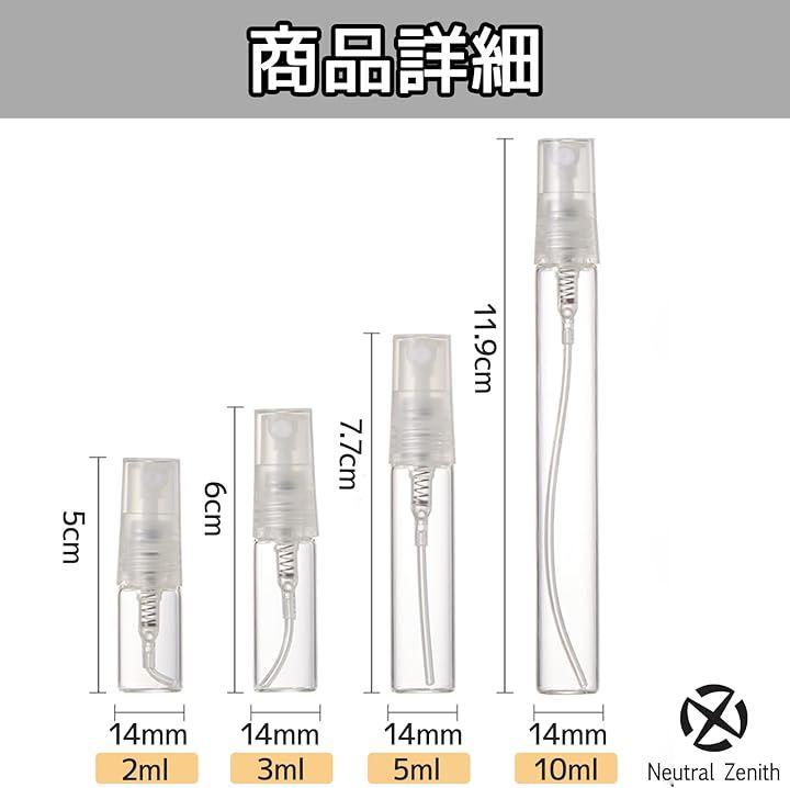 「商品詳細」アトマイザーx20本セット 容量:2ml / 3ml / 5ml / 10ml サイズ:5.0x1.4cm / 6.0x1.4cm / 7.7x1.4cm / 11.9x1.4cm