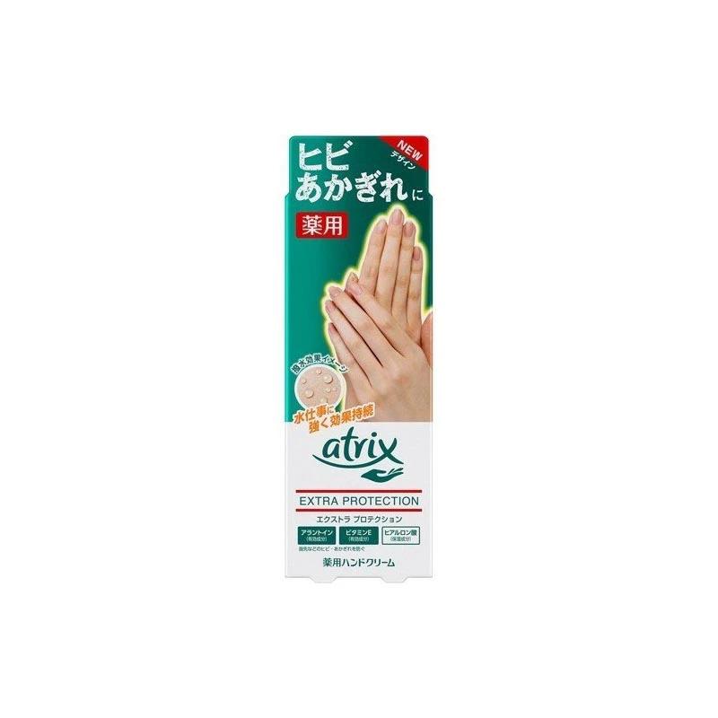 【アトリックス メディケイテッド エクストラプロテクション チューブの商品詳細】●ひどく乾燥し、荒れがちな手肌に密封することで、乾燥や水などの外部刺激から守り、薬効成分が角層深く浸透。素早く働く薬用ハンドクリームです。●高密封集中リペア処方撥水性のある密封膜で覆い、外部刺激から守ります。薬効成分を閉じ込め、お肌に浸透させます。●ヒビ・あかぎれを防ぐ薬効成分:消炎剤アラントイン、血行促進成分ビタミンE配合●保湿成分ヒアルロン酸配合【販売名】アトリックスエクストラプロテクション【使用方法】・適量を手・指先などにお使いください。【成分】アラントイン*、酢酸DL-α-トコフェロール*、水、グリセリン、ジメチコン、ワセリン、PEG-9 ポリジメチルシロキシエチル ジメチコン、シクロペンタシロキサン、ベタイン、ヒアルロン酸Na-2、架橋型ポリエーテル変性シリコーン混合物、架橋型ジメチコン、アクリル酸アルキル共重合体ジメチコンエステル、ジイソステアリン酸ポリグリセリル、ラウロイルグルタミン酸ジ(フィトステリル・オクチルドデシル)、硫酸Mg、エデト酸塩、無水エタノール、クエン酸Na、フェノキシエタノール、パラベン*は「有効成分」無表示は「その他の成分【注意事項】・傷、はれもの、湿疹等の異常があるところには使わないでください。・お肌に異常が生じていないかよく注意してお使いください。お肌に合わない時や、使用中、赤み、はれ、かゆみ、刺激、色抜け(白斑等)や黒ずみ等の異常が出た時、また日光があたって同じような異常が出た時は、使用を中止し、皮フ科医へ相談してください。使い続けると症状が悪化することがあります。・子供や認知症の方などの誤食等を防ぐため、置き場所にご注意ください。・ご使用後は、手がすべることがありますので、ご注意ください。【原産国】日本