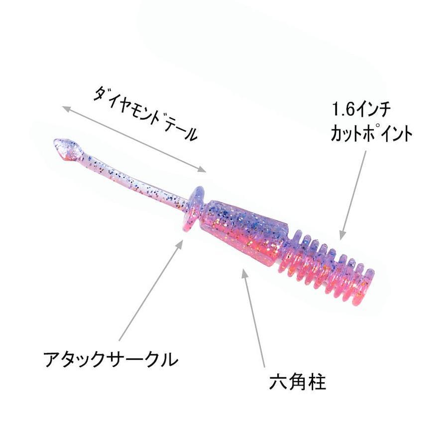 明確にあたりが手元に伝わるよう設計!極力引き抵抗を付ける為、深めのリブ、センター付近にある薄い円盤(アタックサークル)を採用。少しの水流でも、微波動するように、テール先端を8面体にカット(ダイヤモンドテール)しました。本体中盤の六角柱の形状によるフラッシング効果も期待出来ます。深リブ部分にカットマークが入っており、1.6インチにカットしても水平バランスを保ちます。リグの操作感、バイトの多さを体感できるワームとなっております!