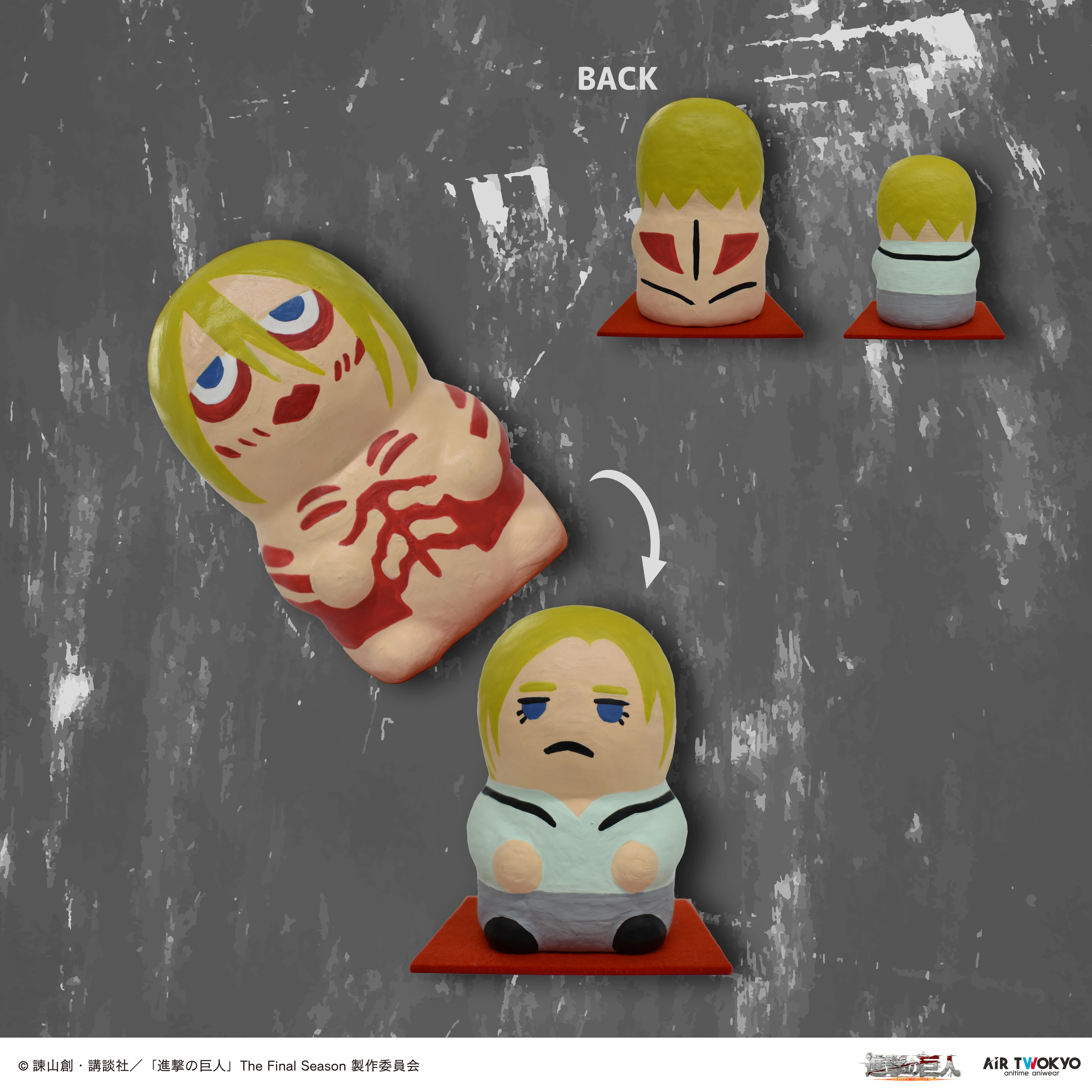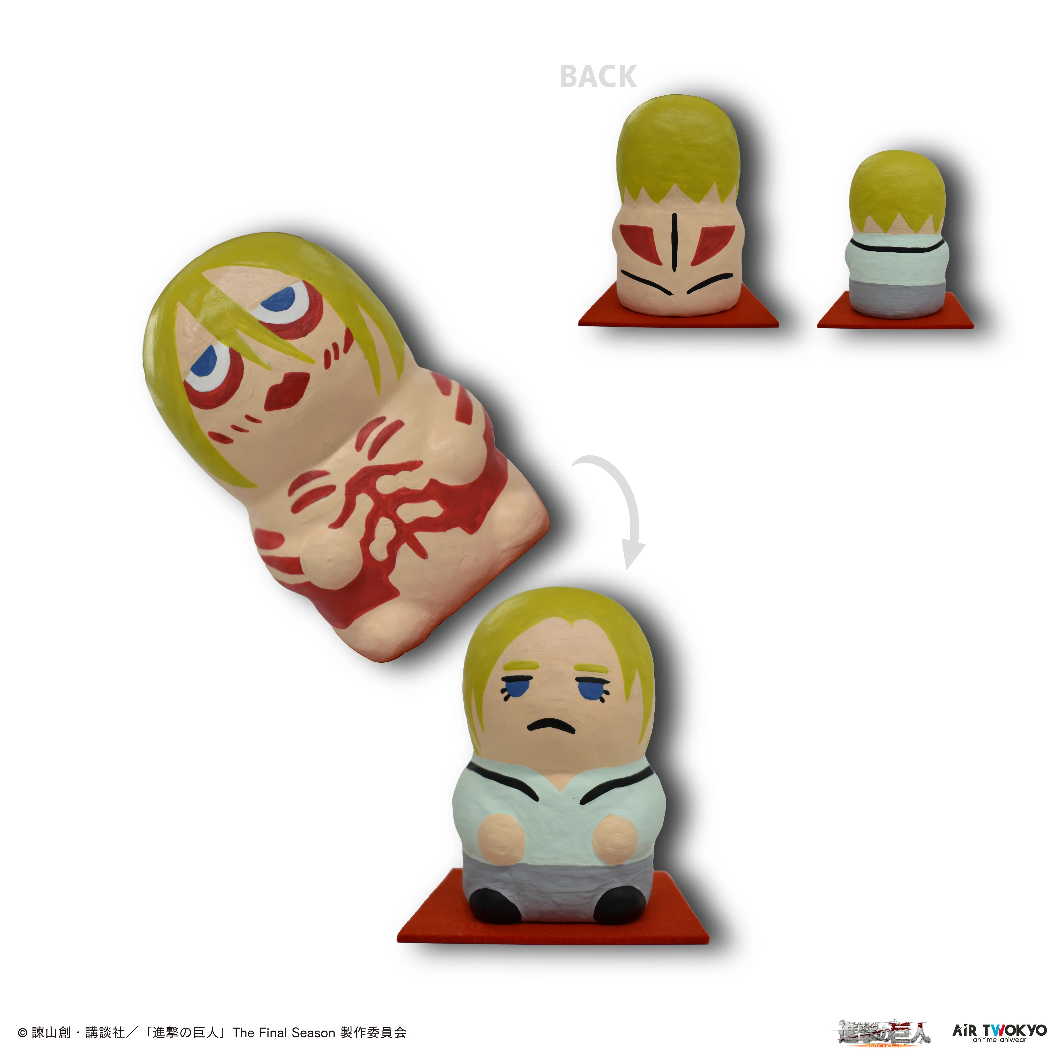 粘土で作った型に一つずつ職人の手で塗り上げた「アニ/女型の巨人 張り子」マトリョーシカのように女型の巨人の中からアニが現れる仕様手作りならではの暖かみが愛嬌のある表情を作り上げており、部屋の中に飾るにはちょうど良いサイズです。※職人が手作り・手描きで制作しているため、表情・色・模様・仕上がりサイズに若干の個体差がございます。それぞれの違いを張り子の特徴としてご理解いただいたうえで、お買い求めください。※絵付けをする際に竹串を刺すため、本体底に小さい穴が開いております。予めご了承ください。 ▼商品内容サイズ:H95mm(アニ)H125mm(女型の巨人)素材:再生紙 (塗料:水性塗料)