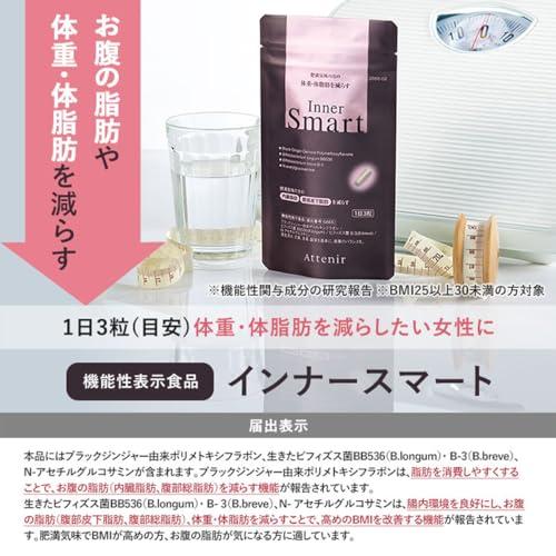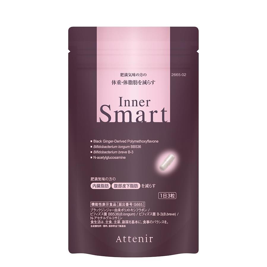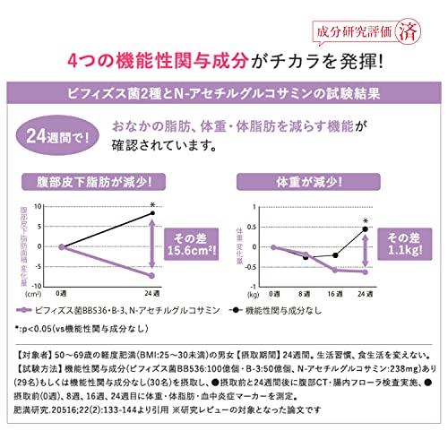 【届出表示】本品にはブラックジンジャー由来ポリメトキシフラボン、生きたビフィズス菌 BB536(B.longum)・B-3(B.breve)、N-アセチルグルコサミンが含まれます。ブラックジンジャー由来ポリメトキシフラボンは、脂肪を消費しやすくすることで、お腹の脂肪(内臓脂肪、腹部総脂肪)を減らす機能が報告されています。生きたビフィズス菌BB536(B.longum)・B-3(B.breve)、N-アセチルグルコサミンは、腸内環境を良好にし、お腹の脂肪(腹部皮下脂肪、腹部総脂肪)、体重・体脂肪を減らすことで、高めのBMIを改善する機能が報告されています。肥満気味でBMIが高めの方、お腹の脂肪が気になる方に適しています。 【機能性表示食品についてのご注意】※本品は、特定保健用食品と異なり、消費者庁長官による個別審査を受けたものではありません。 ※疾病の診断、治療、予防を目的としたものではありません。 ※食生活は、主食、主菜、副菜を基本に、食事のバランスを。 【肥満気味?と気になりはじめた方に】腸内環境を良好にし、体重・体脂肪を減らす2種のビフィズス菌とN-アセチルグルコサミンを配合。脂肪を消費しやすくするブラックジンジャー(ポリメトキシフラボン)をさらに配合することで、おなかの脂肪(内臓脂肪・腹部総脂肪)を減らします。 【1日の目安】 3粒 【機能性関与成分/1日3粒当たり】 ブラックジンジャー由来ポリメトキシフラボン:12mg、ビフィズス菌BB536(B.longum):100億個、ビフィズス菌B-3(B.breve):50億個、N-アセチルグルコサミン:238mg 【機能性表示食品についてのご注意】 ※本品は、特定保健用食品と異なり、消費者庁長官による個別審査を受けたものではありません。 ※疾病の診断、治療、予防を目的としたものではありません。 ※食生活は、主食、主菜、副菜を基本に、食事のバランスを。 【アレルゲン(28品目中)】 えび・かに・卵・乳 【機能性関与成分がおなかの脂肪へアプローチ】[2種のビフィズス菌とN-アセチルグルコサミン]腸内環境を良好にし、おなかの脂肪、体重・体脂肪を減らすことで、高めのBMIを改善します。[ブラックジンジャー由来ポリメトキシフラボン]脂肪を消費しやすくし、おなかの脂肪を減らします。 【届出表示】本品にはブラックジンジャー由来ポリメトキシフラボン、生きたビフィズス菌BB536(B.longum)・ B-3(B.breve)、N-アセチルグルコサミンが含まれます。ブラックジンジャー由来ポリメトキシフラボンは、脂肪を消費しやすくすることで、お腹の脂肪(内臓脂肪、腹部総脂肪)を減らす機能が報告されています。生きたビフィズス菌BB536(B.longum)・ B-3(B.breve)、N-アセチルグルコサミンは、腸内環境を良好にし、お腹の脂肪(腹部皮下脂肪、腹部総脂肪)、体重・体脂肪を減らすことで、高めのBMIを改善する機能が報告されています。 肥満気味でBMIが高めの方、お腹の脂肪が気になる方に適しています。[届出番号:G665] 【ご注意】 ※妊娠・授乳中の方、お子様はお召し上がりにならないでください。 アテニアはファンケルのグループ会社です。