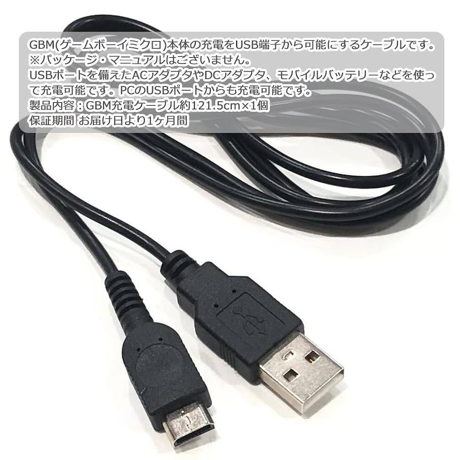 GBM(ゲームボーイミクロ)本体の充電をUSB端子から可能にするケーブルです。※パッケージ・マニュアルはございません。USBポートを備えたACアダプタやDCアダプタ、モバイルバッテリーなどを使って充電可能です。PCのUSBポートからも充電可能です。製品内容:GBM充電ケーブル約121.5cm×1個保証期間 お届け日より1ヶ月間 GBM(ゲームボーイミクロ)本体の充電をUSB端子から可能にするケーブルです。 ※パッケージ・マニュアルはございません。 USBポートを備えたACアダプタやDCアダプタ、モバイルバッテリーなどを使って充電可能です。PCのUSBポートからも充電可能です。 製品内容:GBM充電ケーブル約121.5cm×1個 保証期間 お届け日より1ヶ月間