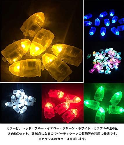 通常1-5営業日で発送:風船内部に入れたり、繋げて装飾する事ができるLEDイルミネーションライトです。カラーは、レッド・ブルー・イエロー・グリーン・ホワイト・カラフルの全6色。各色5点セット、計30点になるのでパーティシーンの装飾等の利用に最適です。※カラフルのカラーは点滅します。点灯方法はON・OFFスイッチで簡単に点灯します。●サイズ 約 30mm×17mm×12mm ●製品内容 LEDバルーンライト 全6色 各色5点 計30点セット●保証期間 お届け日より1ヶ月