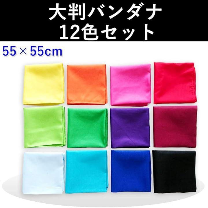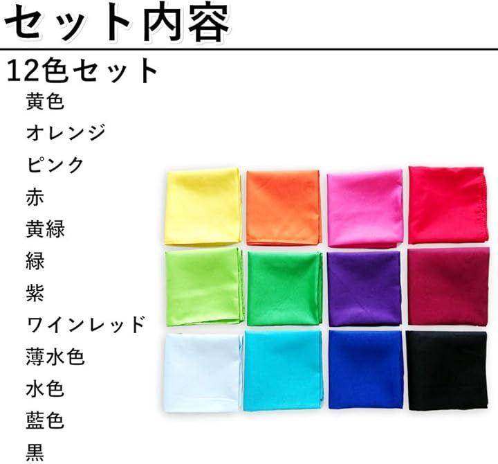 「サイズ」55cmx55cm 「材質」ポリエステル 「セット内容」12色(黄色、オレンジ、ピンク、赤、黄緑、緑、紫、ワインレッド、薄水色、水色、藍色、黒)