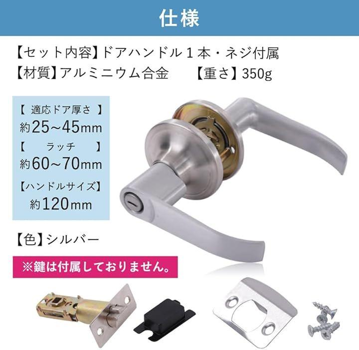 「適用ドア厚さ」約 25-45mm 「ラッチ」約 60-70mm「ハンドルサイズ」約 120mm「重さ」350g「材質」アルミニウム合金「色」シルバー「セット内容」ドアハンドル1本、ネジ付属