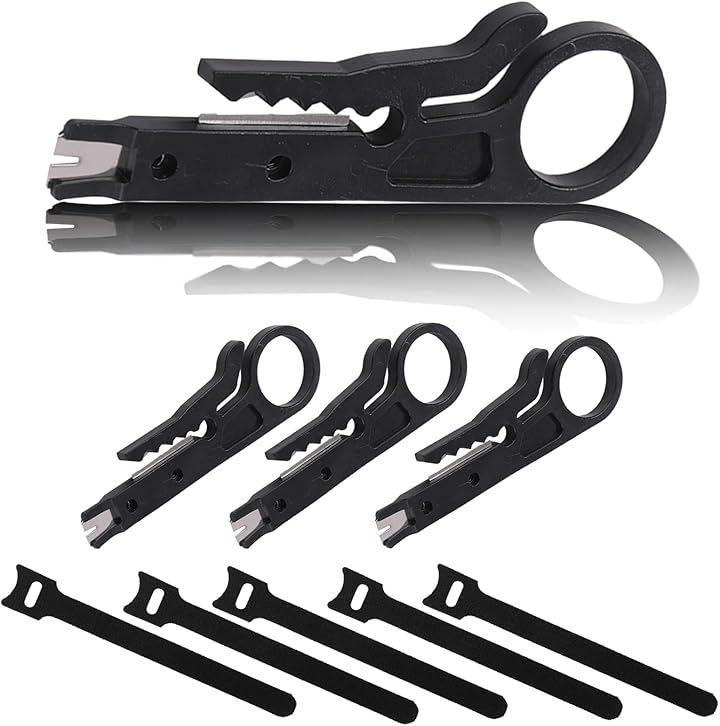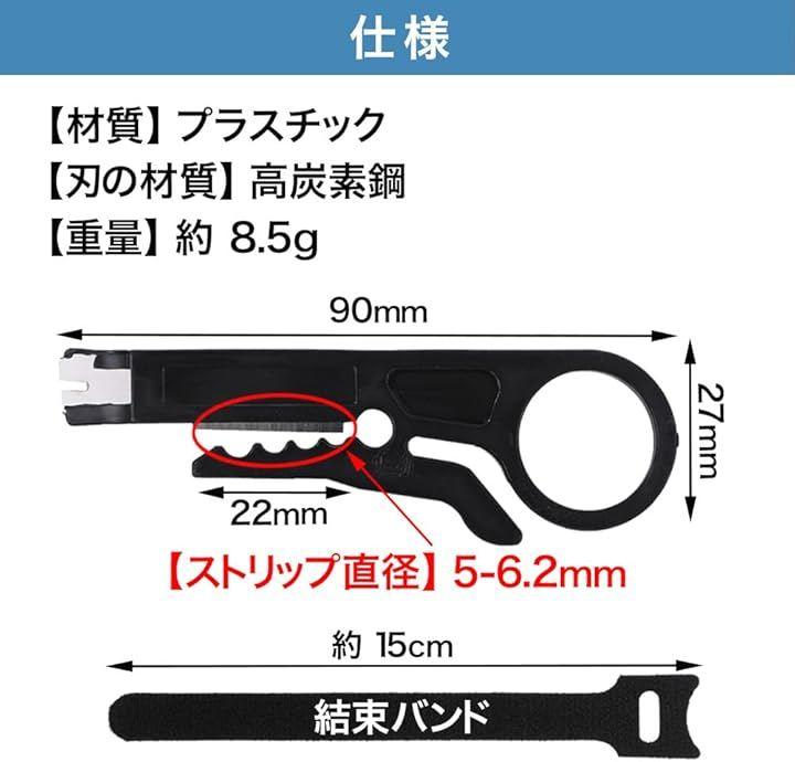 「サイズ」約 90 x 27 mm 「刃幅」約 22 mm 「ストリップ直径」5 - 6.2 mm 「厚さ」 約 2 mm 「重量」約 8.5 g 「材質」プラスチック 「刃の材質」高炭素鋼 「色」グレー 「セット内容」4個セット・長さ約15cmの結束バンド5本付き