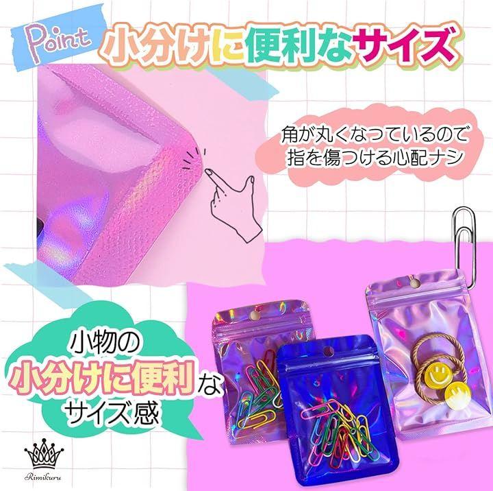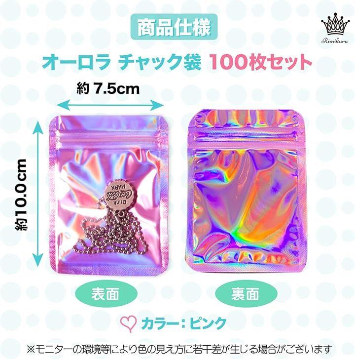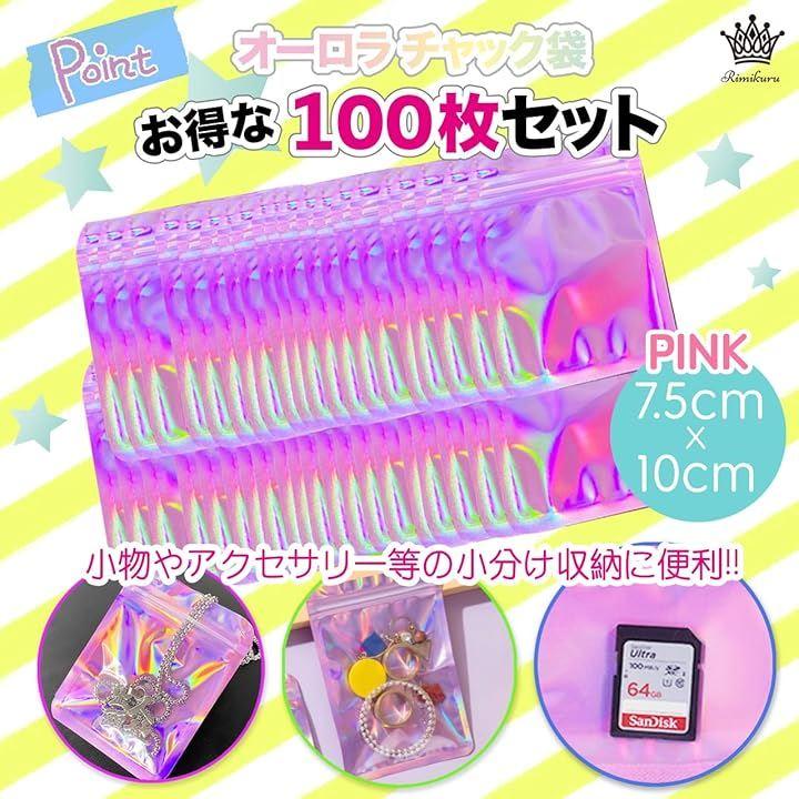 「商品仕様」セット内容:オーロラ チャック袋 100枚セット サイズ:約7.5cmx約10.0cm カラー:ピンク *モニターの環境等により、色の見え方に若干差が生じる場合がございます。