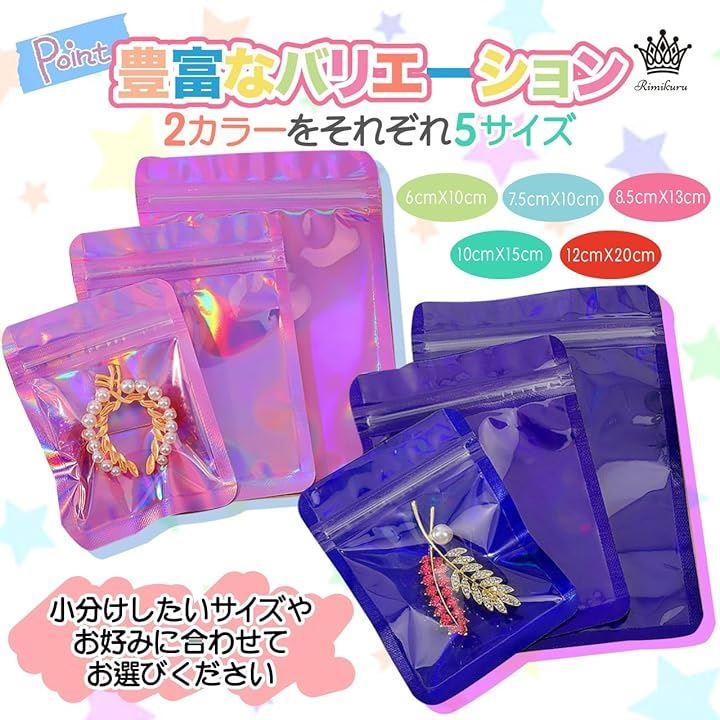 豊富なバリエーション:こちらのオーロラ チャック袋セットはブルーとピンクの2カラーをそれぞれ5サイズ(6cmx10cm,7.5cmx10cm,8.5cmx13cm,10cmx15cm,12cmx20cm)ご用意しましたので、小分けしたいアクセサリーなどのサイズやお好みに合わせてお選びいただけます。