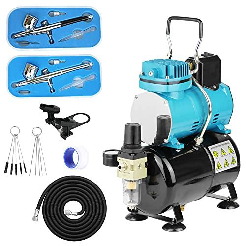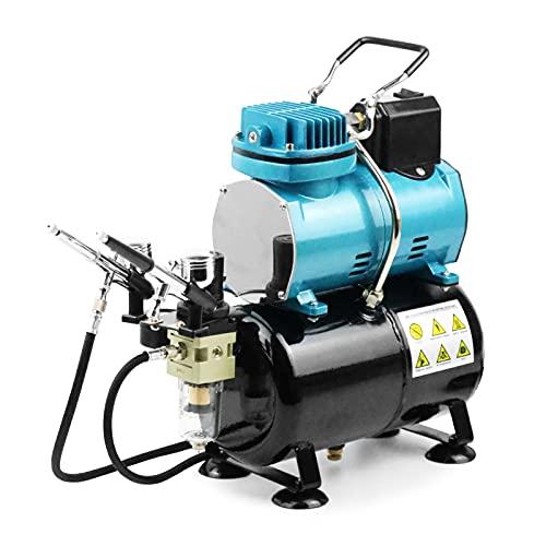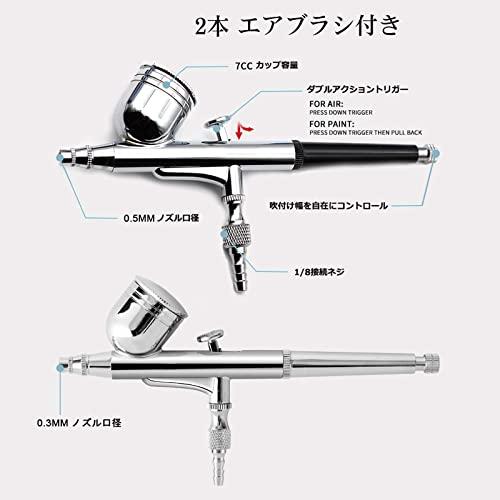 【エアーブラシスターティングキット】2本重力式エアブラシ(1本0.3mmと1本0.5mm) 3Lタンク、冷却ファン付きエアーブラシ用ミニエアーコンプレッサーとのスターターキット初心者と熟練者の方でも気軽に使いやすいタイプです。 【冷却ファン付エアコンプレッサー】過熱せずにそれがより長い継続的な稼働時間のためのクーラーを多く動かすことを可能にする冷却ファンを持つ冷たいランナー高性能化強力1/5HP単一ピストン圧縮機。2つのエアブラシのためのエアブラシホルダーを含む。 【2本エアブラシ付き】ノズル口径0.3mmと0.5mm、容量7cc塗料カップ付き、ダブルアクション式エアブラシは塗料の噴き出し量や線の幅を自由にコントロールできます。広い範囲の塗装から細かい作業まで、これ一本で済ませます。一体型と比べて、より軽くて便利です。 【自動停止機能付き】約4.0kgf/cm2自動停止、3.0kgf/cm2再起動する安心・便利な設計です。静音設計ピストン式で室内作業でも音が気になりません。 【初心者と熟練者向・多用途】プラモデル、プラモデル塗装、芸術アート、DIY手描き、Tシャツペイント、趣味のスプレー、迷彩塗装などいろんな分野で活躍できます。