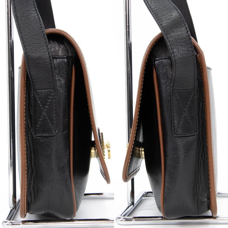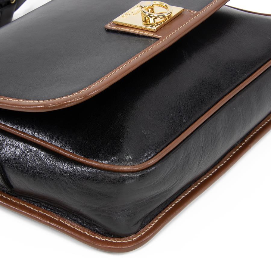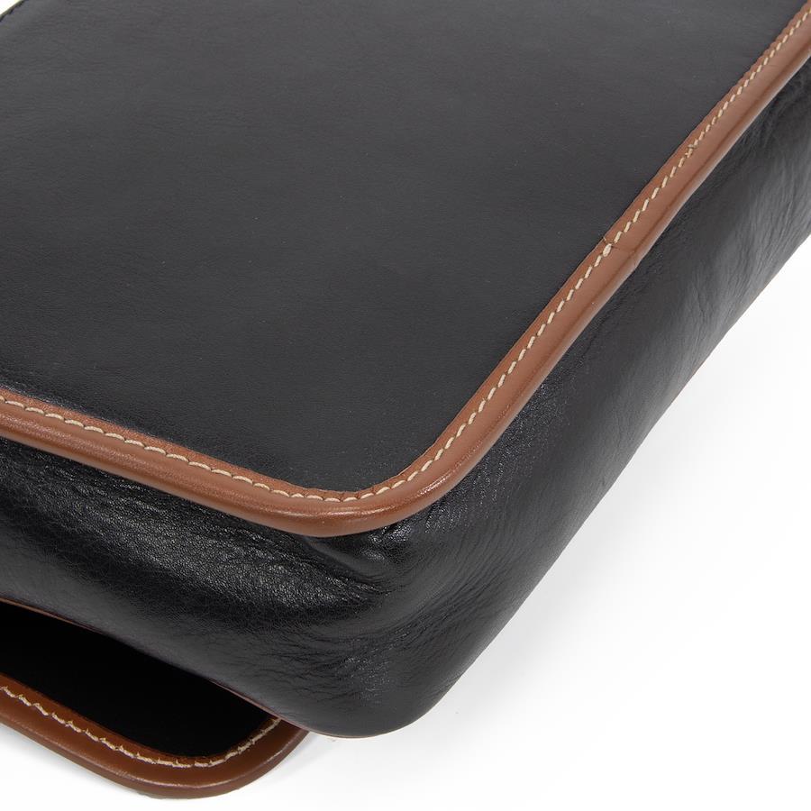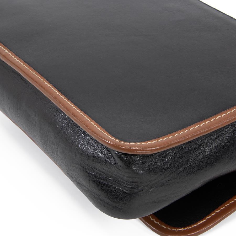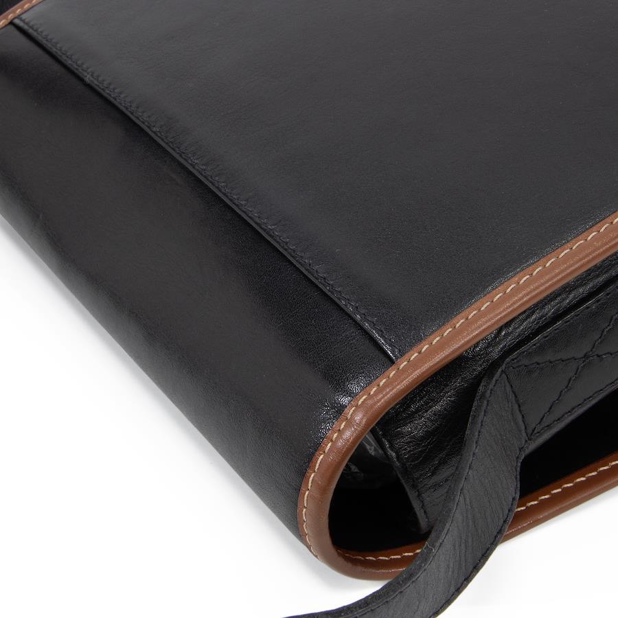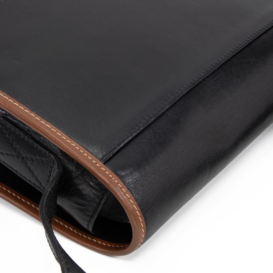 艶やかなブラックのカーフレザーに、温かみのあるブラウンのパイピングが映える、非常に洗練されたデザインでございます。