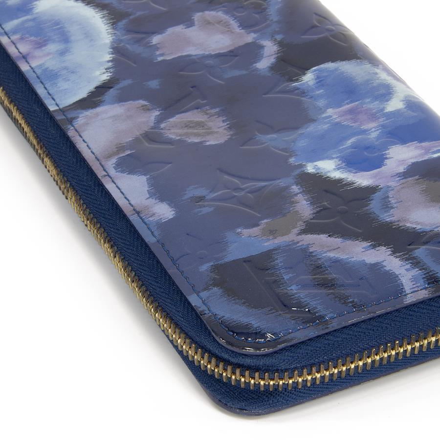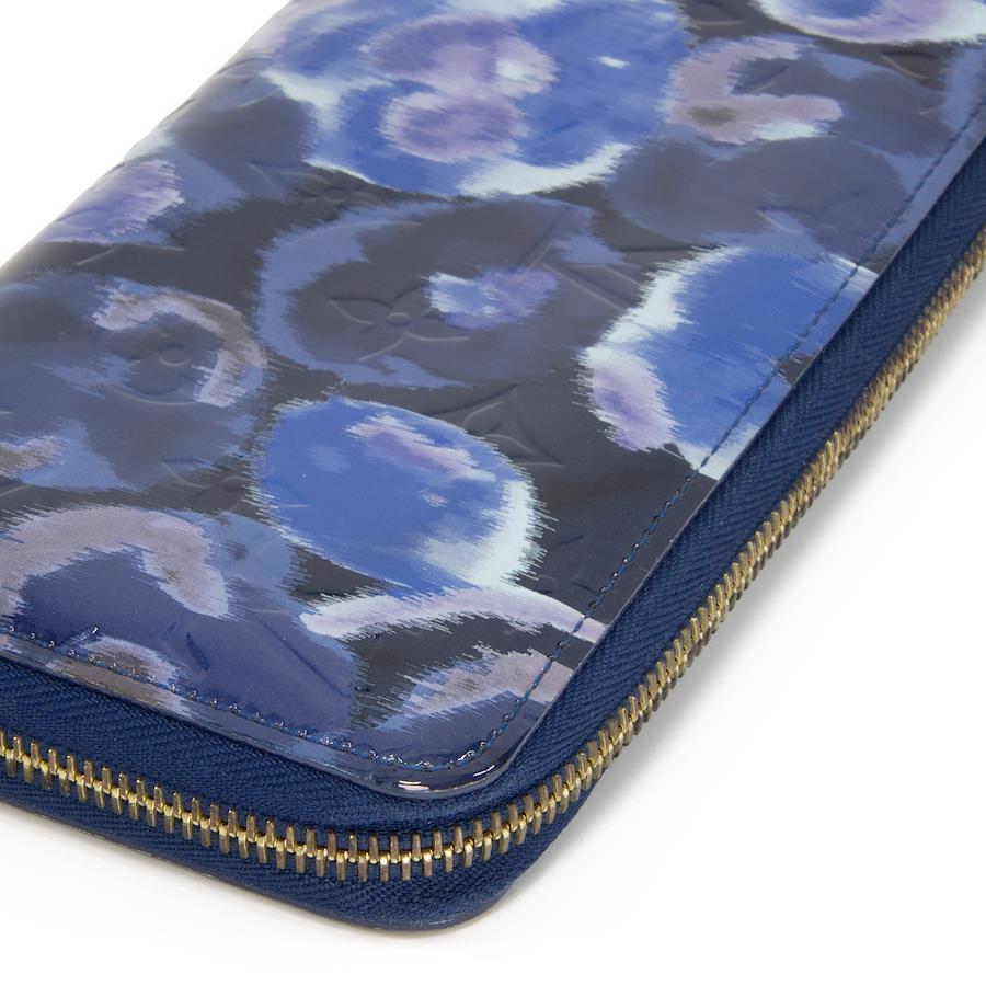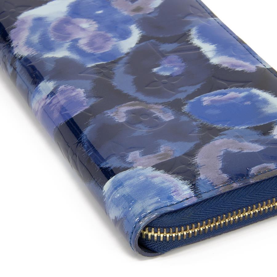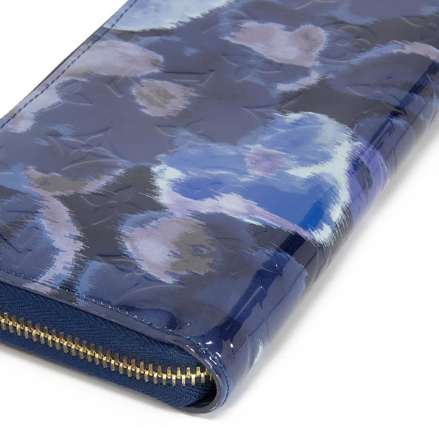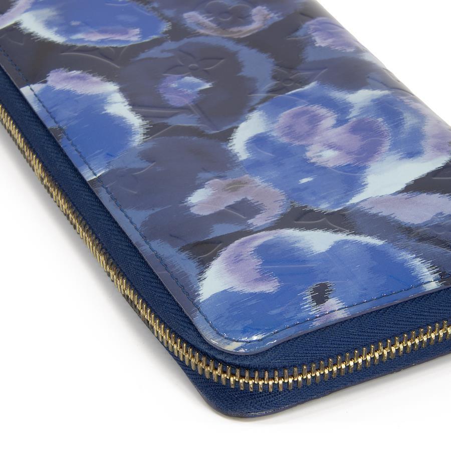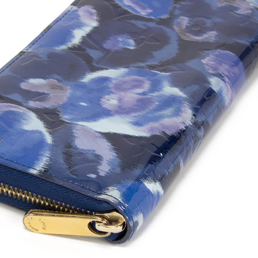 Authentic Louis Vuitton women's patent leather zip-around long wallet featuring Vernis Ikat flower motifs in Grand Bleu, blue, navy blue, and purple. Features the LV logo and monogram. Beautiful and rare. Product number: T029.
