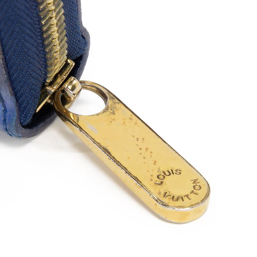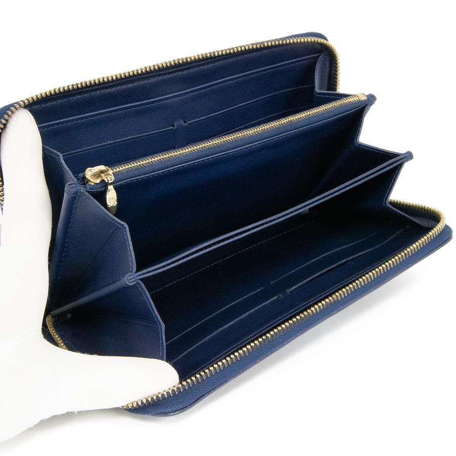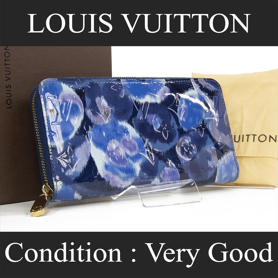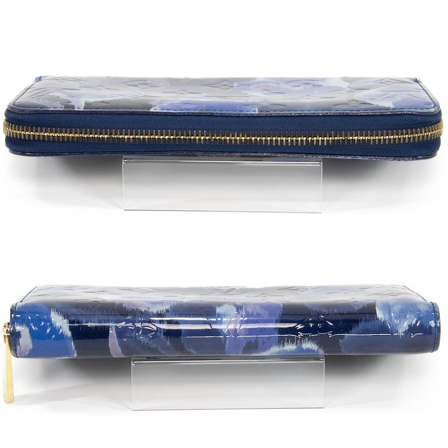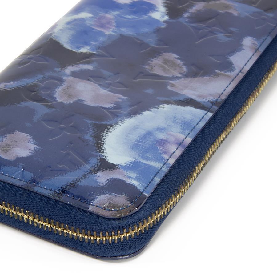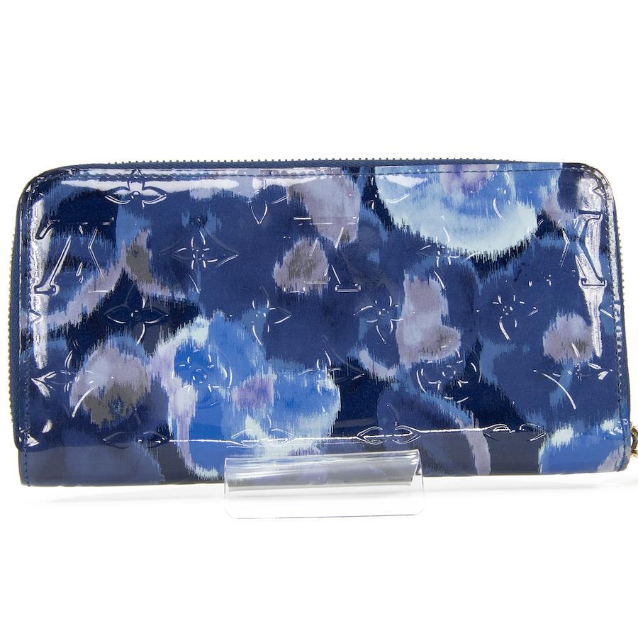 Authentic Louis Vuitton women's patent leather zip-around long wallet featuring Vernis Ikat flower motifs in Grand Bleu, blue, navy blue, and purple. Features the LV logo and monogram. Beautiful and rare. Product number: T029.