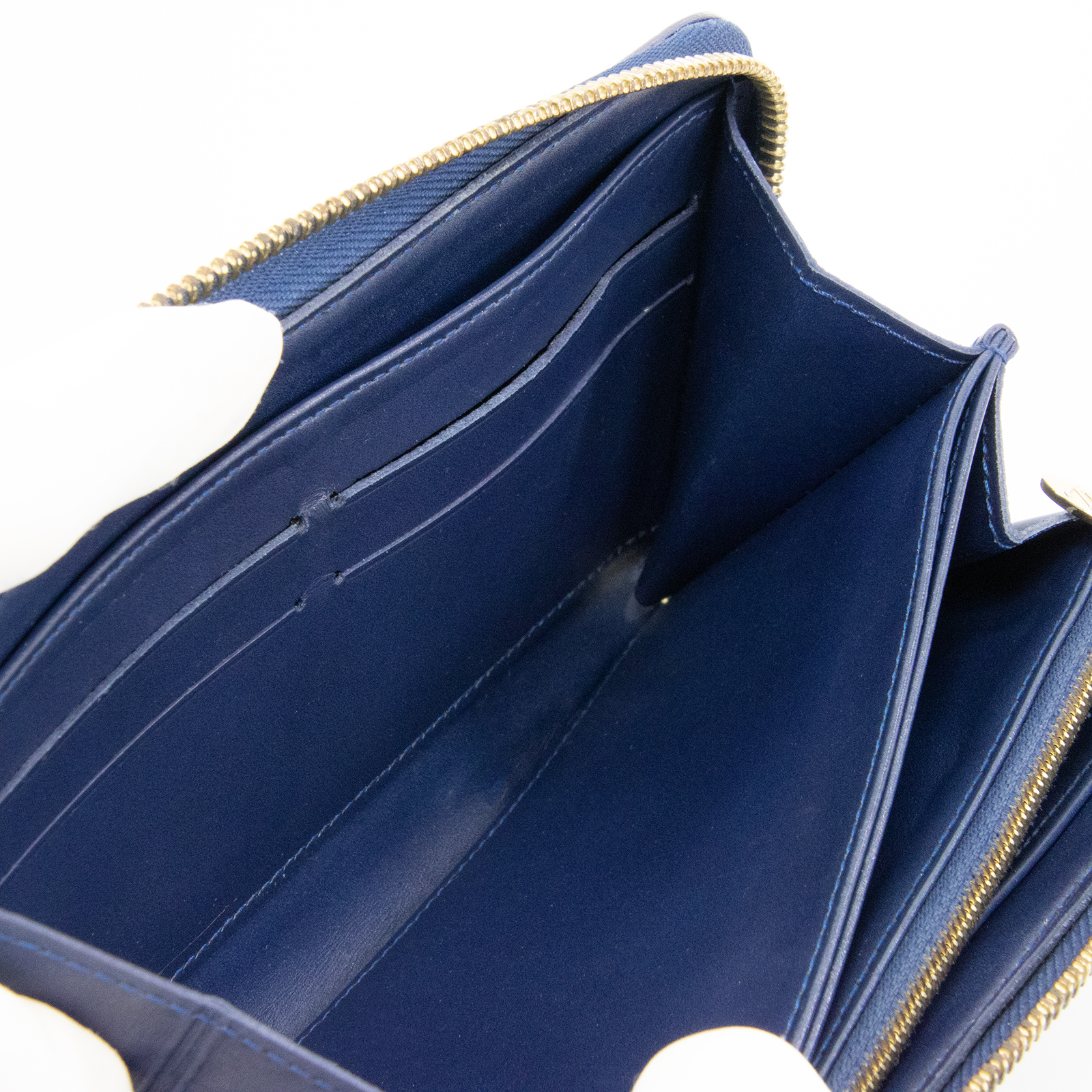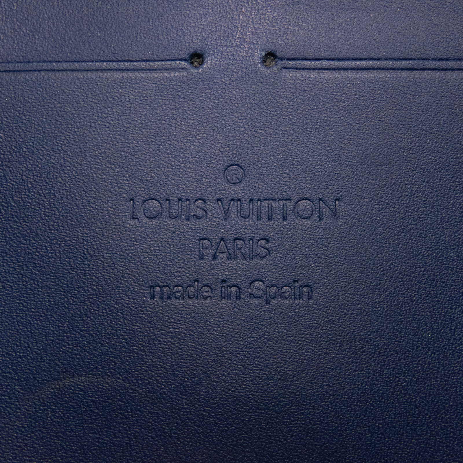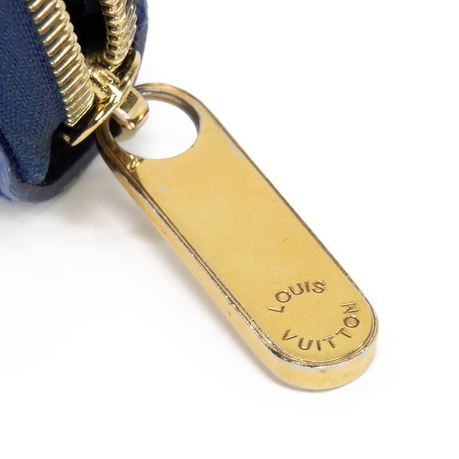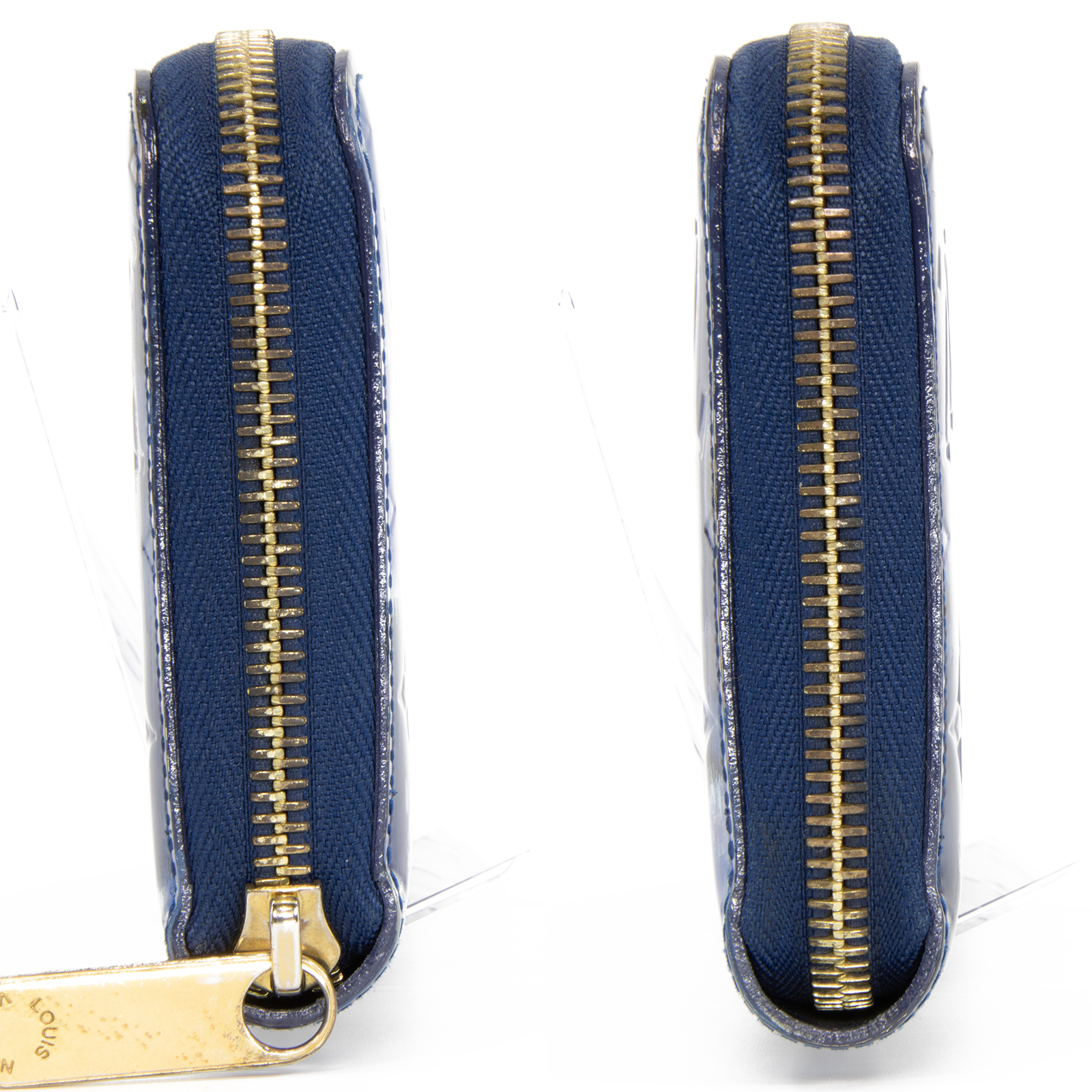 Authentic Louis Vuitton women's patent leather zip-around long wallet featuring Vernis Ikat flower motifs in Grand Bleu, blue, navy blue, and purple. Features the LV logo and monogram. Beautiful and rare. Product number: T029.