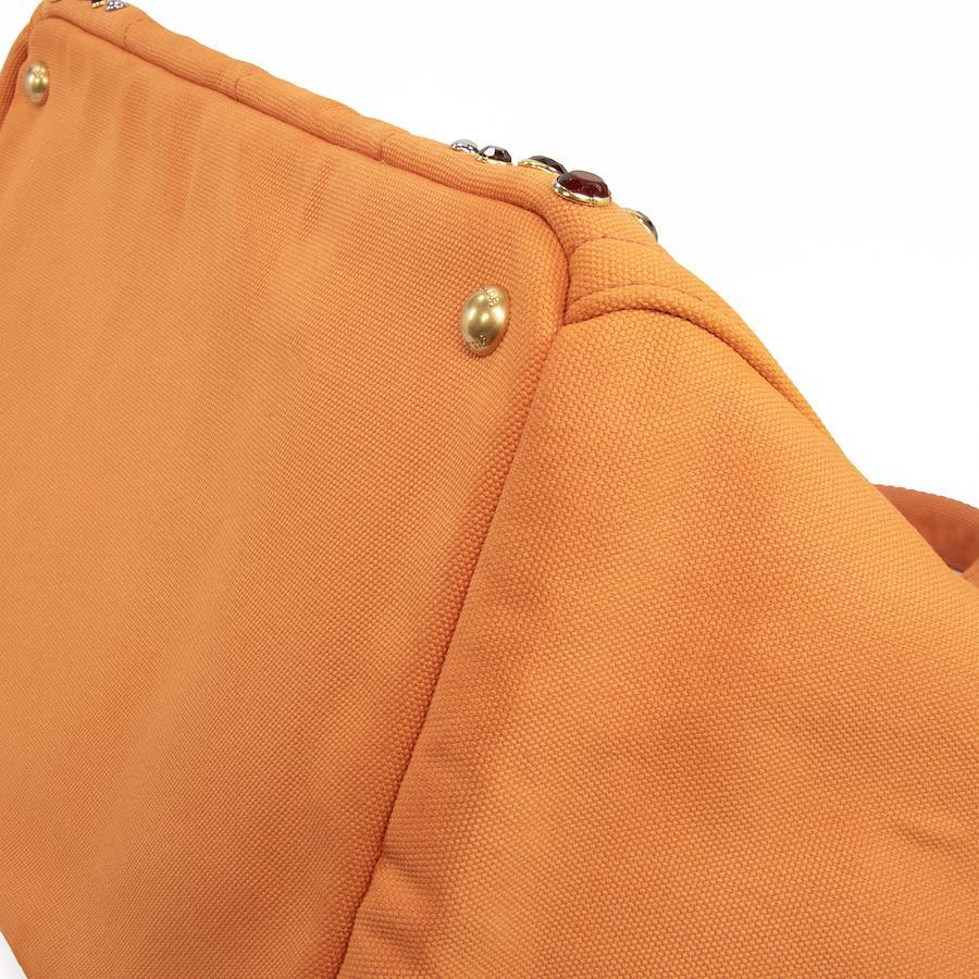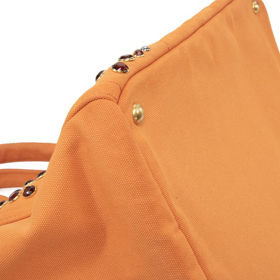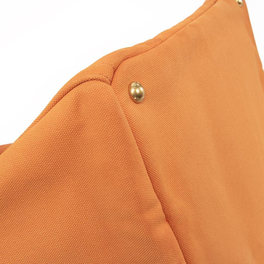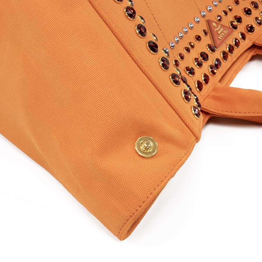 鮮やかなオレンジのキャンバス地に、大小様々なスタッズがきらびやかに輝き、リッチなアクセントを添えます。