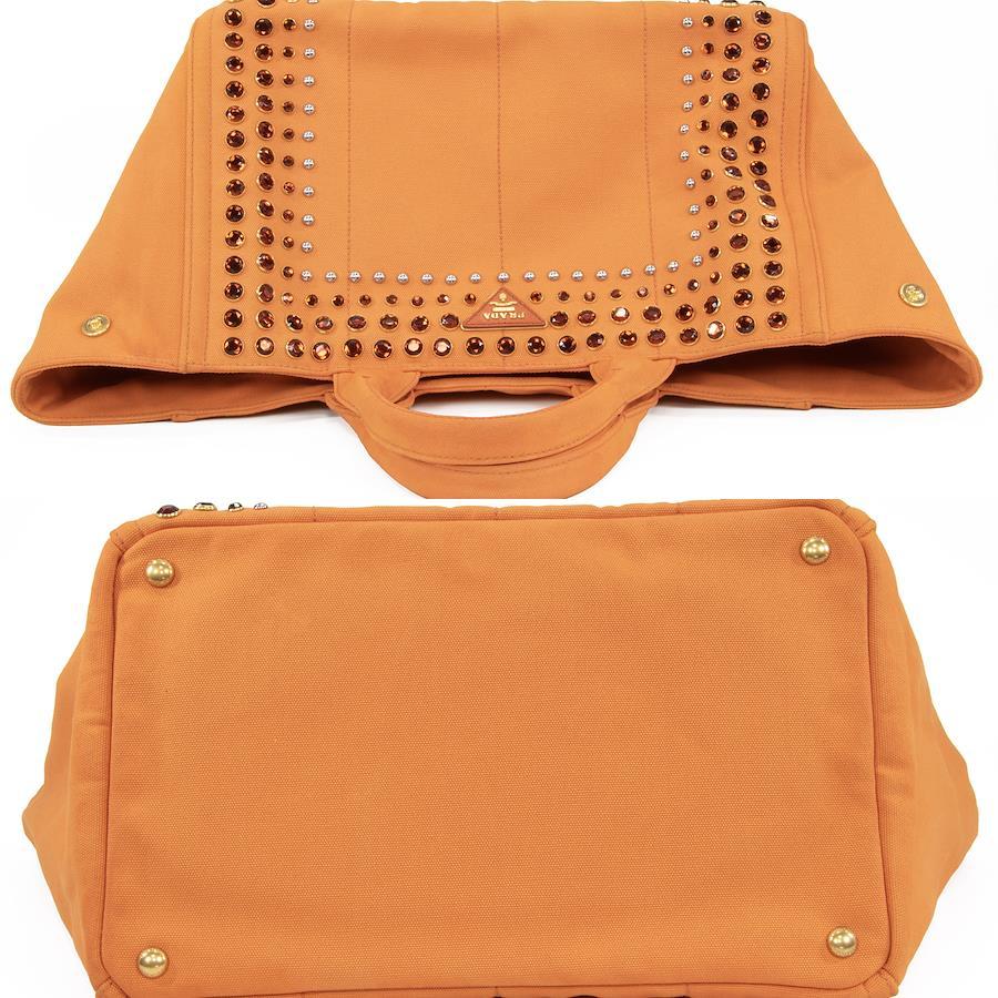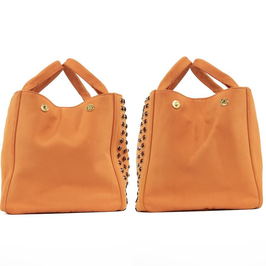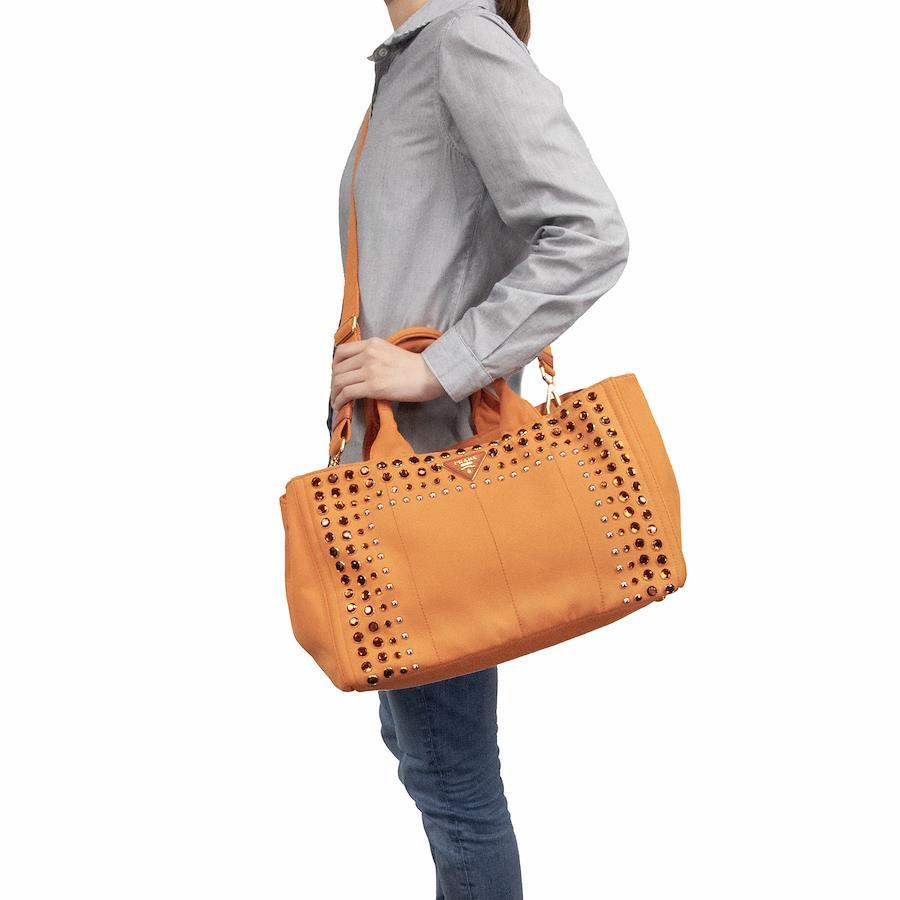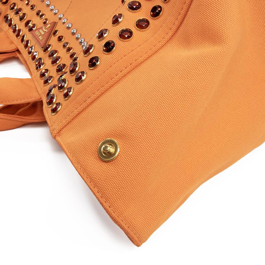 鮮やかなオレンジのキャンバス地に、大小様々なスタッズがきらびやかに輝き、リッチなアクセントを添えます。