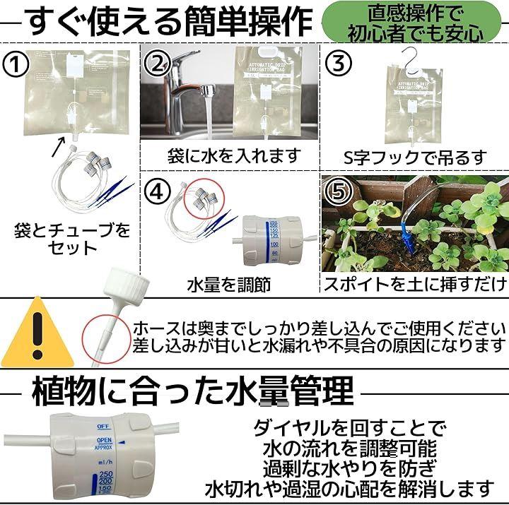 「すぐ使える簡単操作」 使い方はシンプル。袋とチューブをセットし注水後、水量を調節し付属のS字フックで吊るしスポイトを土に挿すだけ。