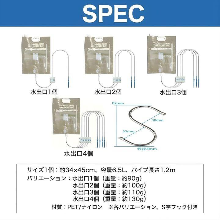 「商品仕様」サイズ1個:約34x45cm、容量6.5L 、パイプ長さ約1.2m、S字フック付 (重量:約100g) / 材質:PET/ナイロン *「水出口1個 2セット」、「水出口2個 2セット」、「水出口3個 2セット」、「水出口4個 2セット」のバリエーションをご用意しているので、お好きなものをお選びください。
