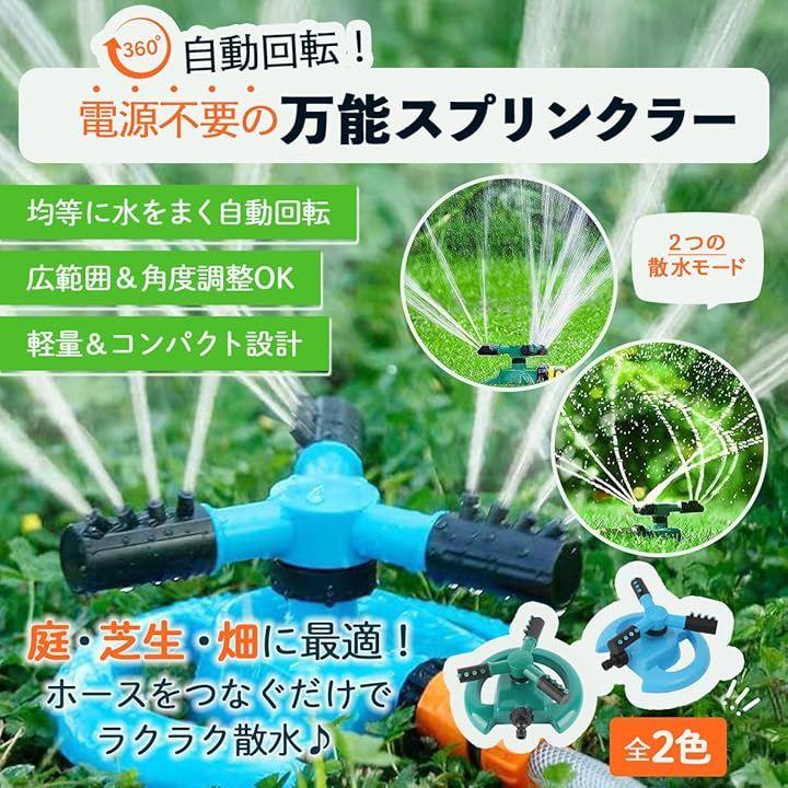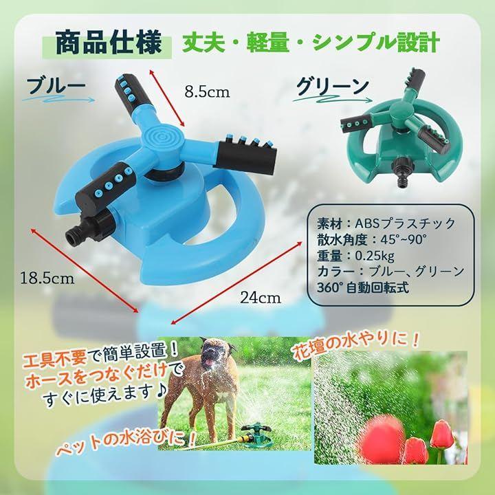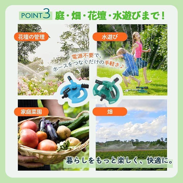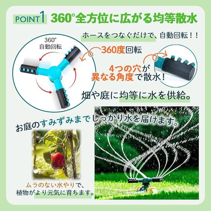 「高性能360度回転散水で庭全体を均一に潤す」 360度回転機能により、庭や花壇、芝生の隅々までムラなく水を届けることができ、家庭菜園や庭園の水やり作業を効率化します。