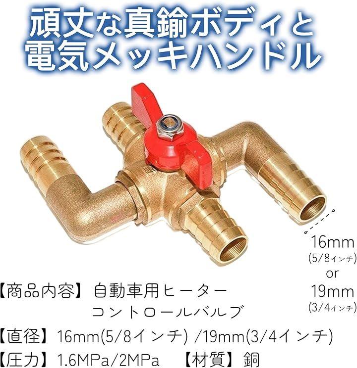 「商品内容」自動車用ヒーターコントロールバルブ「カラー」ゴールド「サイズ」16mm(5/8インチ) /19mm(3/4インチ)「圧力」1.6MPa/2MPa「素材」銅