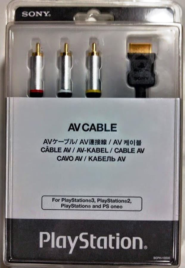 AVケーブル「SCPH-10500」。 線材に高精細画質の伝送を可能にする高純度OFC(無酸素銅)を採用し、従来のケーブルと比べてよりクオリティの高い映像や音質をお楽しめる。また、端子部には接触抵抗が少なく、錆に強い高耐久性24K金メッキプラグを採用している。「プレイステーション 2」「プレイステーション」でも使用可能。