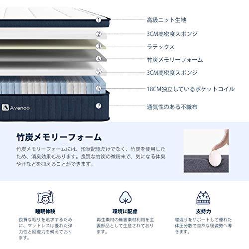 【26cmラグジュアリーな睡眠体験】冷感素材と高反発性スポンジを組み合わせた厚み26cmのマットレス セミダブルです。寝返りするたびにひんやりと気持ちよく、ぐっすり眠ることができます。快適の秘密は、天然素材テンセルの採用による自然な心地よさです。セミダブル マットレスは多層構造で、ふんわりとした質感となり、その柔らかさは、まるで一晩中「パン」の上で寝ているような感覚です。【消臭・調湿】メモリーフォームに竹炭を採用しています。竹炭には消臭効果だけでなく、湿気の多いときには、余分な湿気を吸収し、寝具内の湿度を調整する「調湿効果」もあります。竹炭を採用した形状記憶高反発マットレスにより、リラックス効果に加え、消臭・調湿効果もあります。【高反発力・高吸収】お客様に、よりふんわりとした感覚をお届けするために、ラテックスを採用しています。ラテックスは数万個の空気穴が開いているため、通気性に優れています。また、身体の曲線に合わせて包み込む「吸収性」と、しっかり支える「高反発」のあるセミダブルマットレスです。Avencoの寝具は、国際睡眠製品協会(ISPA)認可であり、お客様へより心地良い眠りを追求しています。【高品質2.2㎜コイルを採用】ポケットコイルマットレスは、独立したコイルの並行配列です。これは、人間工学に基づいて研究開発を繰り返し行い、究極の眠りを求めて開発されたもので、きしみにくく、快適な寝心地を実現したものです。ベッドマットレスは、2.2㎜線径のコイルを採用し、一般的なコイルよりサポート力が強いです。また、9ゾーン構造により、体に負担の掛からない姿勢が維持できます。【圧縮ロール梱包】マットレス セミダブルのサイズは120cm×195cm×26cmです。丁寧に圧縮、清潔な箱に収め、発送します。圧縮ロール梱包により、輸送の困難が軽減され、狭い玄関でも簡単に入ります。開封後は、平らな場所に置いて3日から1週間ぐらいで十分に復元できますCertiPUR-USおよびOEKO-TEXの国際認証を取得し、素材は有害物質含有試験に合格しており、安心してご使用になれます。