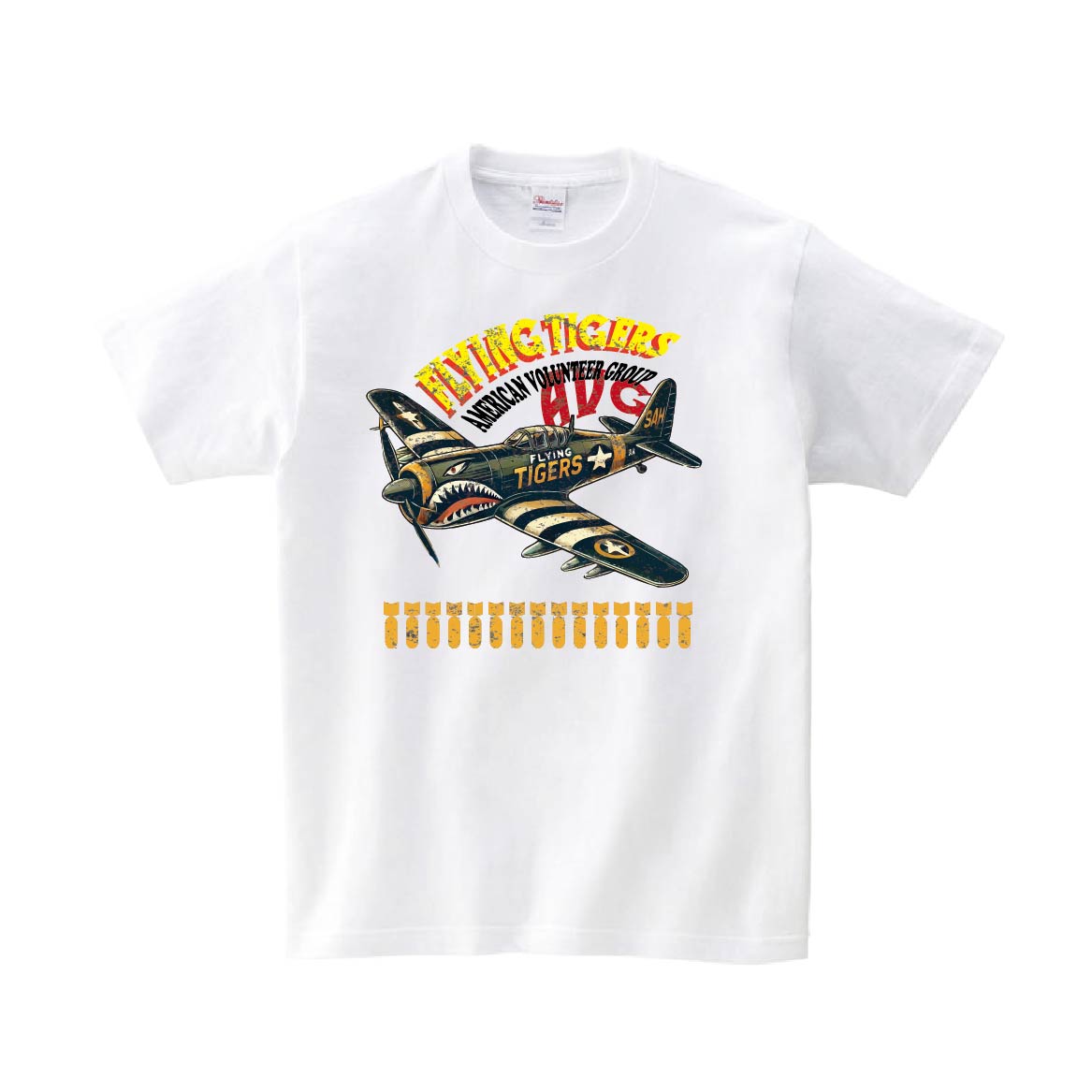 日中戦争時に活動したフライングタイガースのモチーフTシャツです。※画像ははめ込み画像となり、実際とは多少異なりますので予めご了承ください。 ※サイズ表をよくご確認の上ご購入ください。 ※受注生産となるため、返品、交換はご遠慮ください。