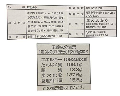 名 称:味つけのり原材料名:乾のり、しょうゆ油(大豆、小麦を含む)、砂糖、 干しえび、昆布、かつお節、みりん、食塩、清酒、 香辛料、調味料(アミノ酸等)、甘味料(天草)内 容 量:8切48枚(板のり6枚分)、2本【重要】メーカーによる商品リニューアルに伴いパッケージ(内容量も含む)変更が行われた場合、新パッケージでお届け致します事ご了承願います。