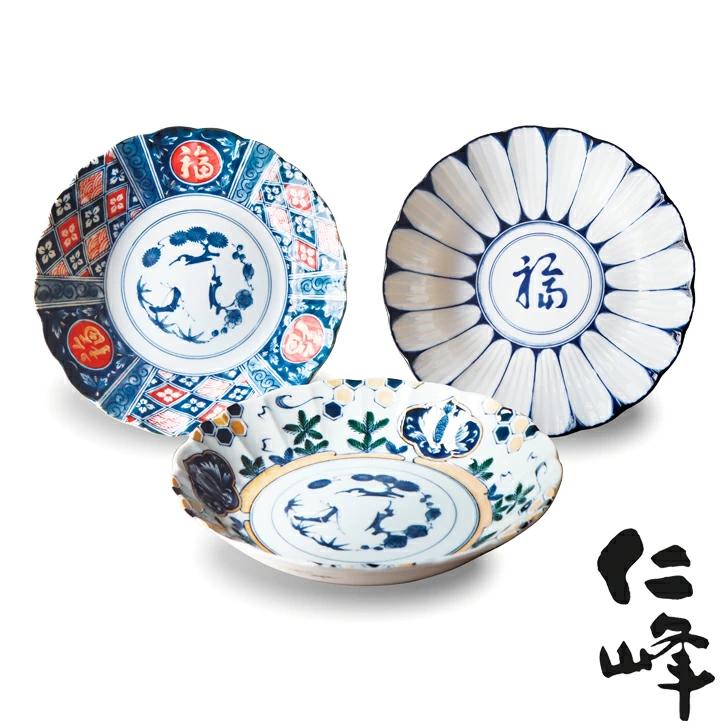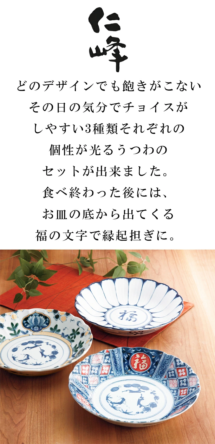 どのデザインでも飽きがこない、その日の気分でチョイスがしやすい3種類それぞれの個性が光るうつわのセットが出来ました。食べ終わった後には、お皿の底から出てくる福の文字で縁起担ぎに。
