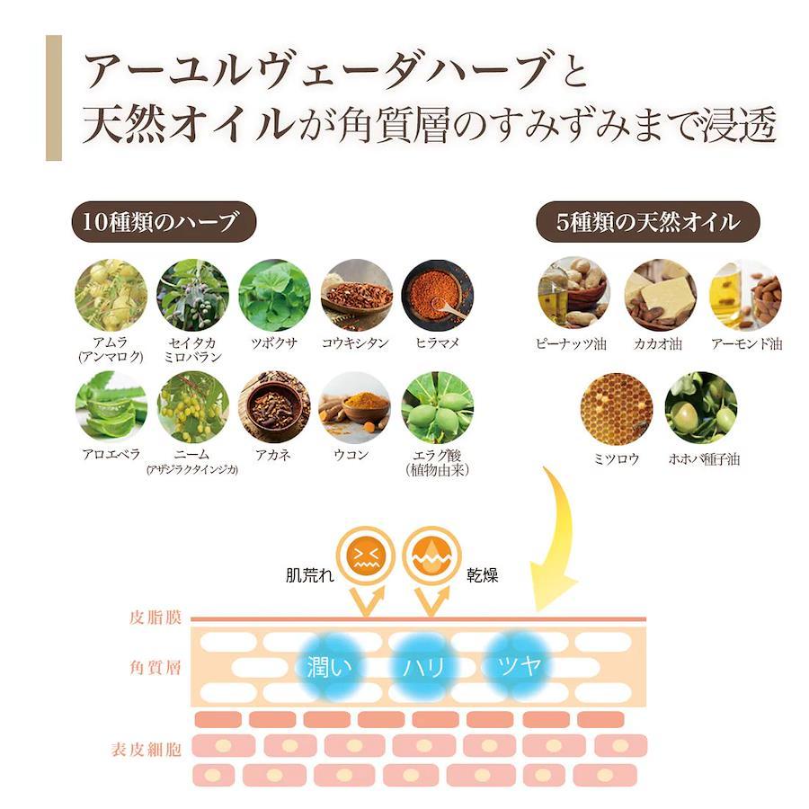 We researched hundreds of traditional Ayurvedic herbs that are said to be good for beautiful skin and discovered 10 optimal combinations. Contains 10 types of herbs and 5 types of natural oils to prevent skin dryness, keep it healthy, and reduce the appearance of fine lines.