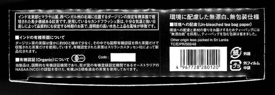 インド北東部ヒマラヤ山麗、西ベンガル州の北端に位置するダージリンの指定有機農園で栽培された希少価値ある紅茶です。使用しているセカンドフラッシュ茶は十分な気温と強い日差しによって品質的にも安定する時期のお茶で、透明度の高い水色と上品な風味が特徴です。ダージリン茶の茶園は僅かに約90と極めて少なく、その中でも国際有機認定証を得た茶園だけで収穫された茶葉だけを使用しています。環境への配慮と素材の香りをお届けするためにティーバッグには無漂白紙を採用し、ティーバッグを包む包装は省きました。