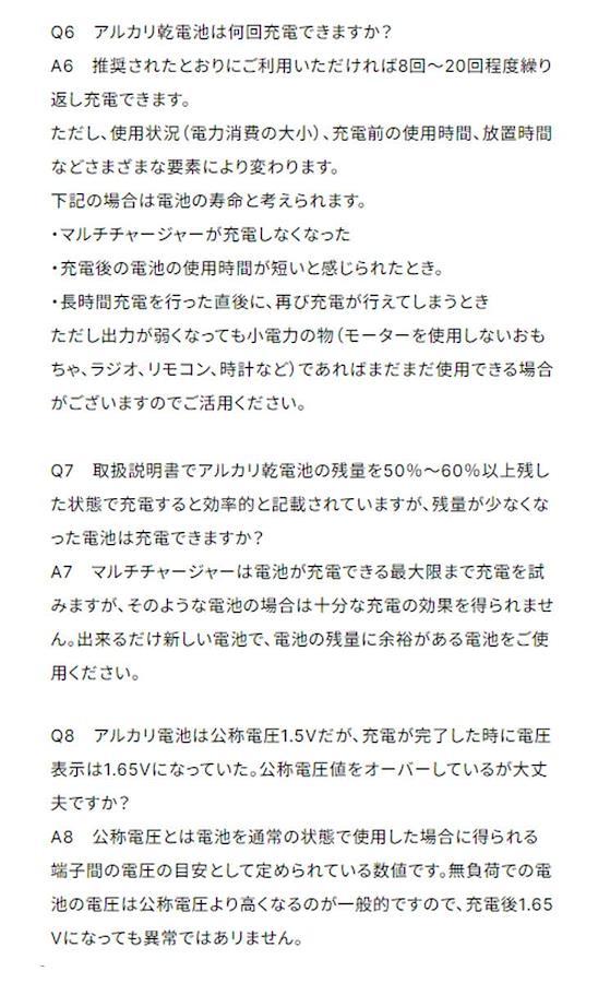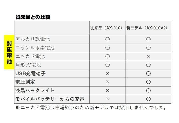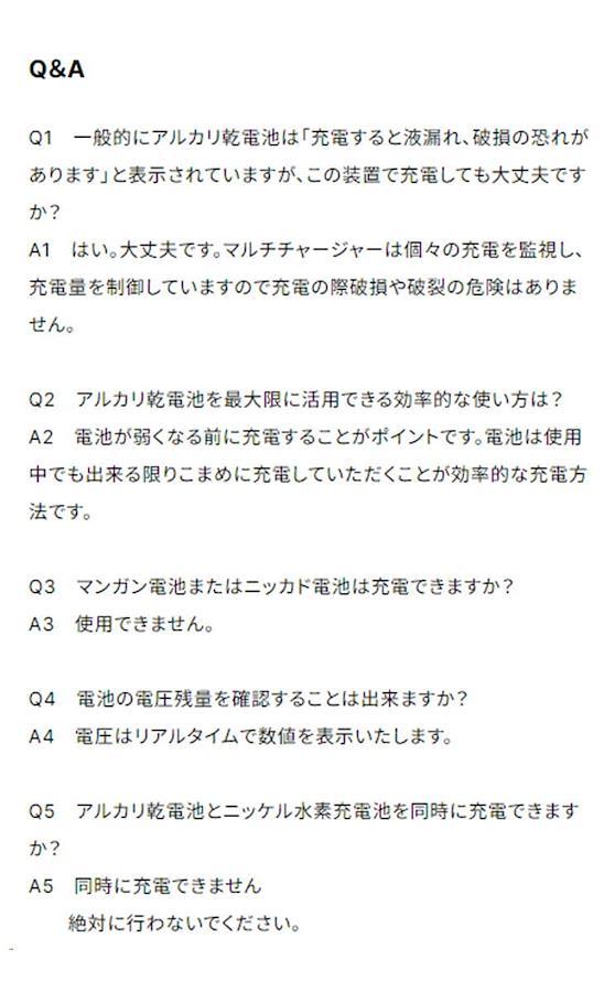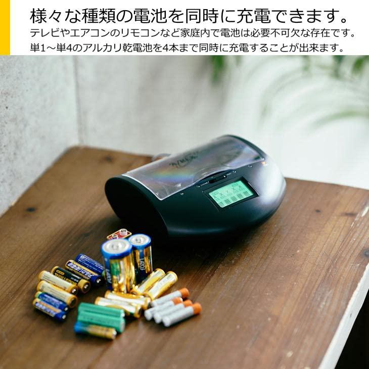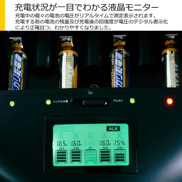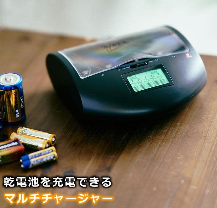 3営業日以内に発送≪新品未開封品≫:AZREX マルチ・チャージャーが機能を増やして大きくバージョンアップ! ・リアルタイム電圧モニターで乾電池の充電状況が一目でわかる ・USB端子搭載でスマホなどを充電できる ・停電などの緊急時に外部バッテリー(モバイルバッテリーなど)からの給電で 乾電池を充電できる 使い捨てアルカリ乾電池を小まめに充電して最大約5~10倍長持ち!(自社テスト) 使用可能電池サイズ : 単一・単二・単三・単四・9V電池 使用可能電池 : ニッケル水素充電池・使い捨てアルカリ乾電池 家庭で電池を使用している、テレビのリモコン、エアコンのリモコン、めざまし時計、 電気製品、子どものおもちゃなどなど・・ 全部まとめて一気に電池を充電できます 今まで捨てていたアルカリ乾電池を簡単充電。 使い方は簡単!充電する電池を本体に入れるだけ。 後はマイクロプロセッサー内蔵のマルチ・チャージャーが充電を安全に制御します。 充電中・充電完了も一目でわかる液晶ディスプレイも搭載。 リアルタイムで電圧を表示するので電池の残量なども一目でわかる 同時に充電する電池の種類が同じならサイズは単一・