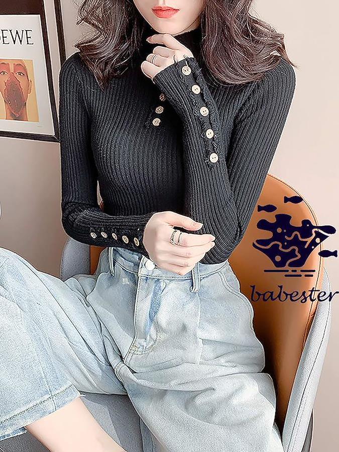 Babe Star Rib Knit Sweater Women's Cut and Sewn Tops Long Sleeve Tight B454-BK