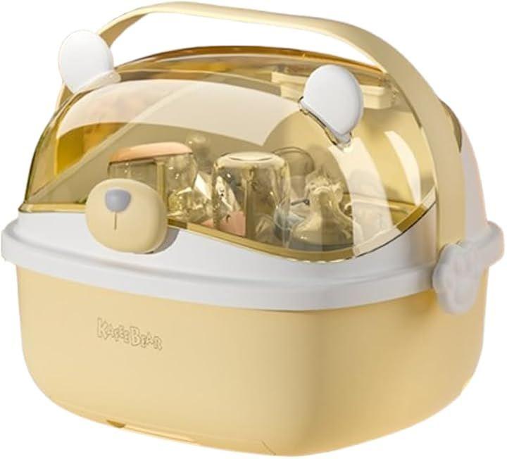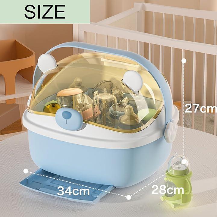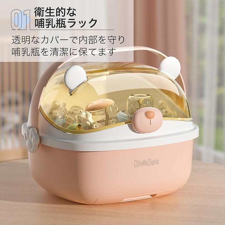 「衛生的な哺乳瓶ラック」 透明なカバーで内部を守り、哺乳瓶を清潔に保てます。