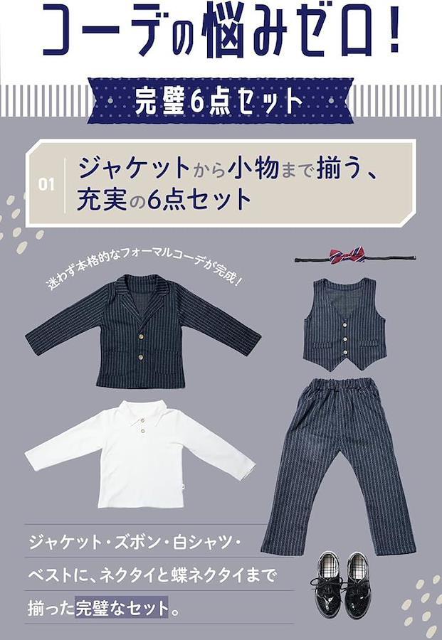 「フルセットで手間いらず」スーツ上下・ベスト・白シャツ・ネクタイ・蝶ネクタイの6点セットでコーデ完成。