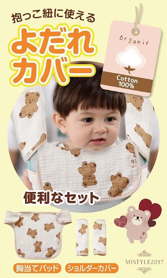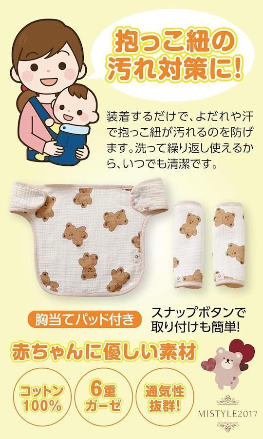 「抱っこ紐の汚れ対策に」スナップボタンで留めるだけで、赤ちゃんのよだれや汗で抱っこ紐が汚れるのを防げるカバーです。