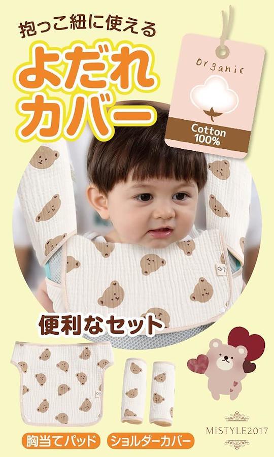 「抱っこ紐の汚れ対策に」スナップボタンで留めるだけで、赤ちゃんのよだれや汗で抱っこ紐が汚れるのを防げるカバーです。