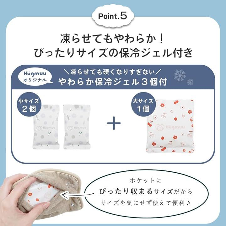 「凍らせてもやわらか。ぴったりサイズの保冷ジェル付き」凍らせても硬くなりすぎないやわらか保冷ジェルが付属。
