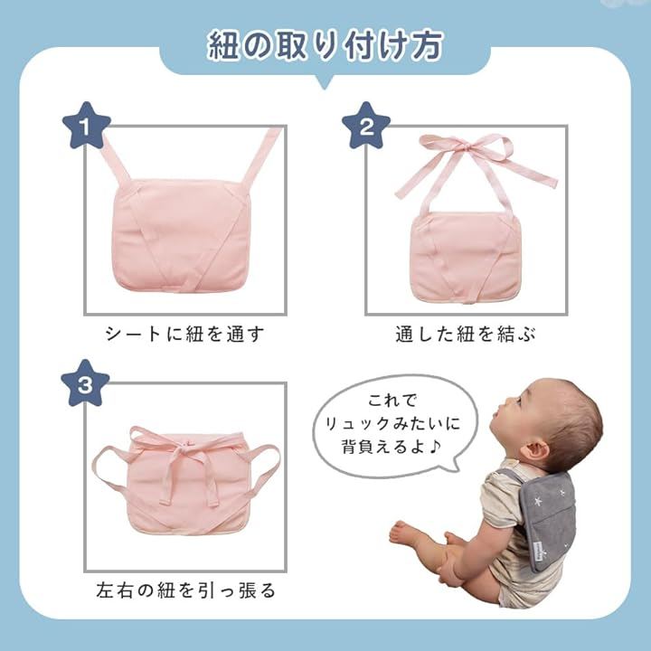 リュックにも枕にも変身」抱っこ紐に取り付けたり、着脱式の紐でリュック風にしたり、用途によって使い分けできます。