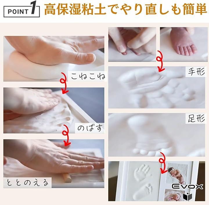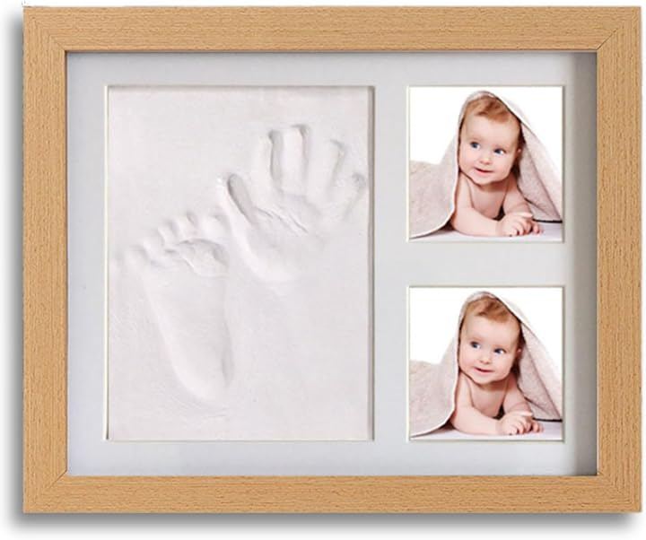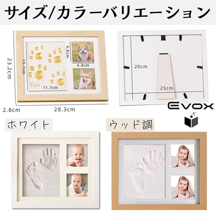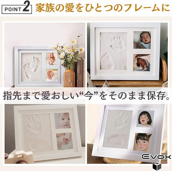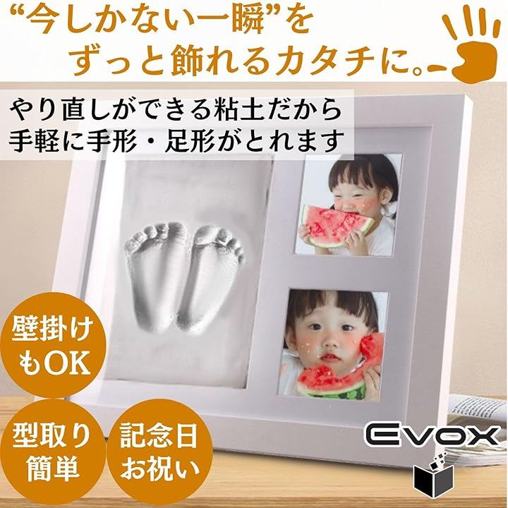 「赤ちゃんの手形スタンプを思い出として残せるデザイン」赤ちゃんの手形足形を記録できるフォトフレームで、写真と一緒に飾れるメモリアル仕様。