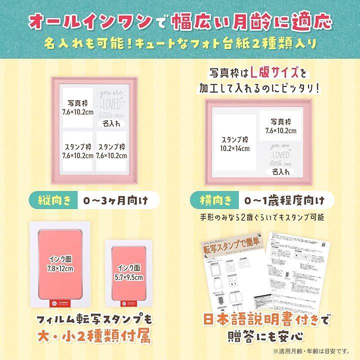 「月齢を問わず長く使えるオールインワン仕様」 縦向き・横向きの両方に対応したかわいい台紙と、大小2種類の転写スタンプがセットになっているので、新生児から2歳頃まで幅広くご使用いただけます。