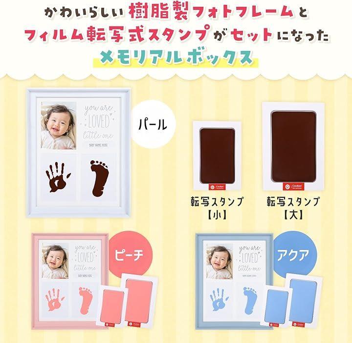 「フォトフレームと転写スタンプのセット」 赤ちゃんやペットの手足を汚さずにかんたんに形が残せる、フィルム転写タイプのスタンプと、かわいらしい樹脂製フォトフレームをセットにしたメモリアルボックスです。