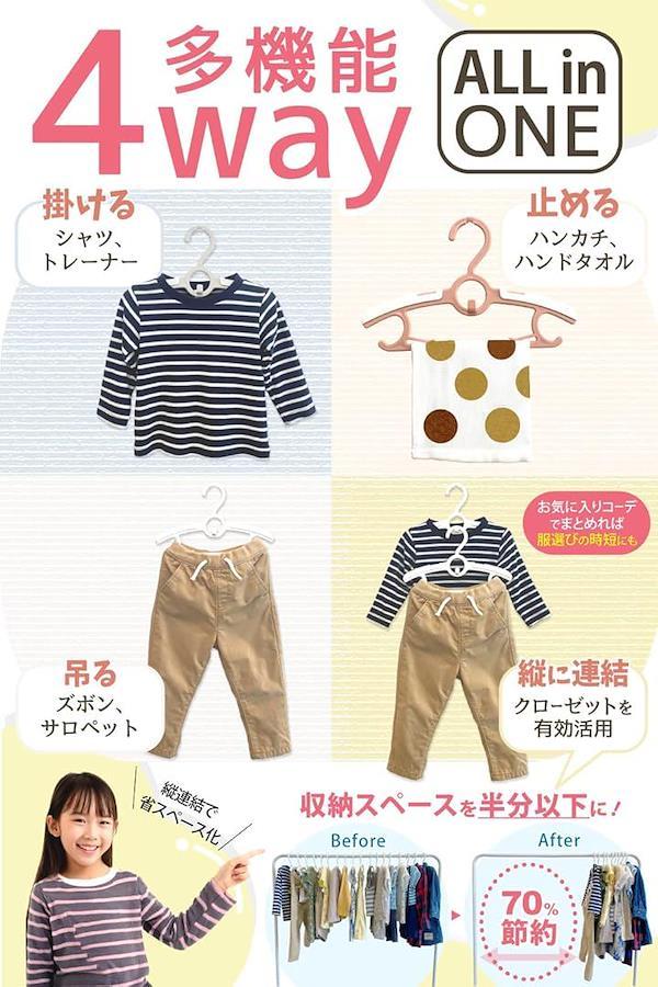 引っ掛ける場所が多いので、「シャツ、ズボン、サロペット、ガーゼタオル、靴下」などのアイテムもこれ一つでOK。「掛ける・吊り下げる・止める・連結する」の便利な4Way多機能ハンガーです。