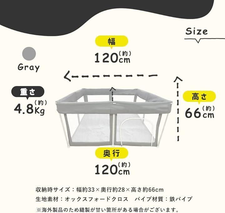 「製品仕様」本体サイズ:「使用時」(約)幅120x奥行120x高さ66cm「収納時」(約)幅33x奥行28x高さ66cm(布がはみ出た部分は含みません)「内寸」(約)幅118x奥行118x高さ66cm 本体重量:4.8kg、カラー:グレー、素材:オックスフォードクロス、鉄パイプ *生産は海外で行っており、糸のほつれ、細かいキズ、多少の汚れ、多少の匂い、外箱の傷等がある場合がございます。
