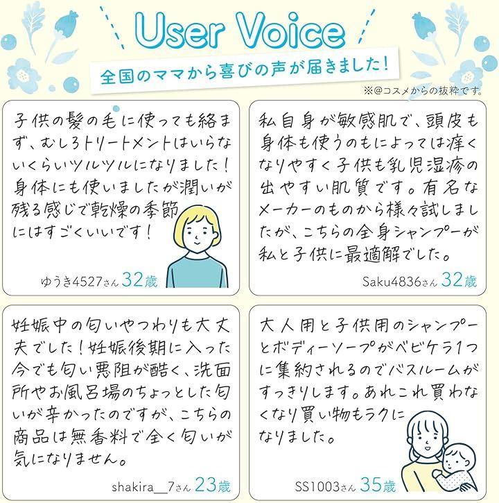 赤ちゃんから大人ま で、髪も体も1本でやさしく洗える全身シャンプーです。