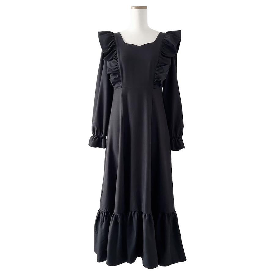 たっぷりフリルとバックリボンが魅力的なワンピース。【デザイン】肩フリルや裾フリルたっぷりな、上品で可愛らしいアイテムです。背中はVラインに開いているので程よく肌みせしつつ、ポイントのリボンでバックルスタイルを華奢見せ。ハイウエストの切り替えと縦の切り替えラインで、着痩せ効果も抜群です。左脇ファスナーを開けて、頭から被って着用いただく仕様です。