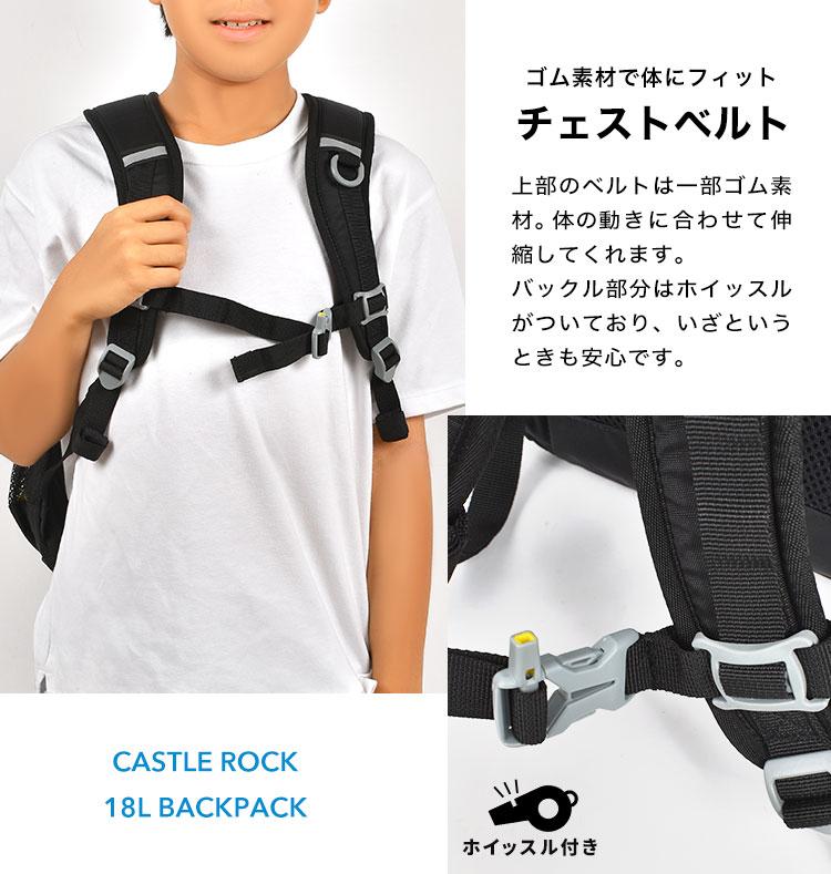 【キャッスルロックユース18Lバックパック】ネーム記入用ラベルやホイッスル、撥水・防汚生地などお子様に嬉しい機能を豊富に備えたバックパック。背面は中央に通気路を設けた通気性の良い背面構造で、蒸れを軽減し快適に背負う事ができます。メインルームはA4サイズを折らずに収納でき、アウトドアはもちろん、通学などの普段使いにもオススメ。