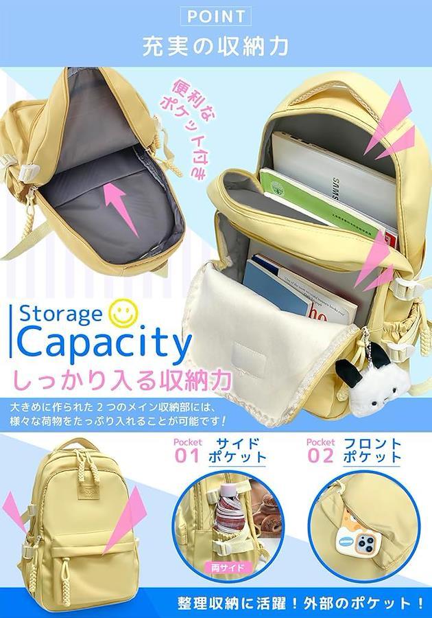 学校に持ち運ぶ教科書やPCなどの貴重品をすっぽりと簡単に収納できるメインスペースをはじめ、折りたたみ傘やペットボトルの収納に便利なサイドポケットやすぐに取り出したい小物を入れておけるフロントポケット。