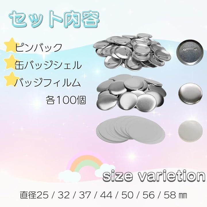 「サイズ」: 直径25mm / 32mm / 37mm / 44mm / 50mm / 56mm / 58mm / 75mm「セット数」100個「セット内容」: 缶バッジシェル、ピンバック、バッジフィルム