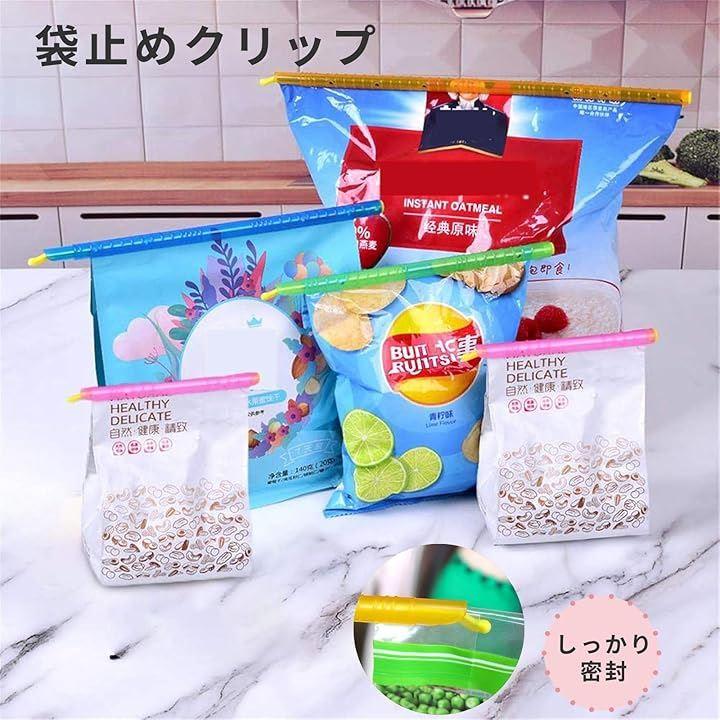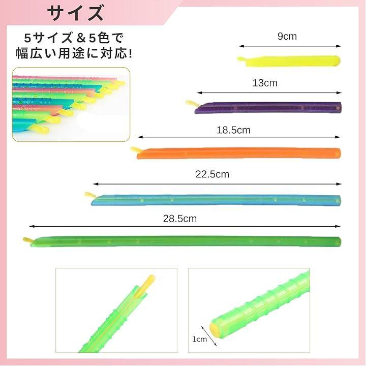 ・セット内容:袋止めクリップ(5サイズx5色)・サイズ構成:(約)9cm/13cm/18.5cm/22.5cm/28.5cm・(バリエーションあり)・材質: プラスチック・用途:袋止め/袋 クリップ/調味料保存/お菓子/パン/冷凍ご飯/にどめ/密封/乾燥防止/フードクリップ