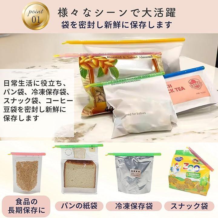 お菓子、パン、冷凍ご飯、コーヒー豆などの袋とじに使用でき、湿気対策に有効です。